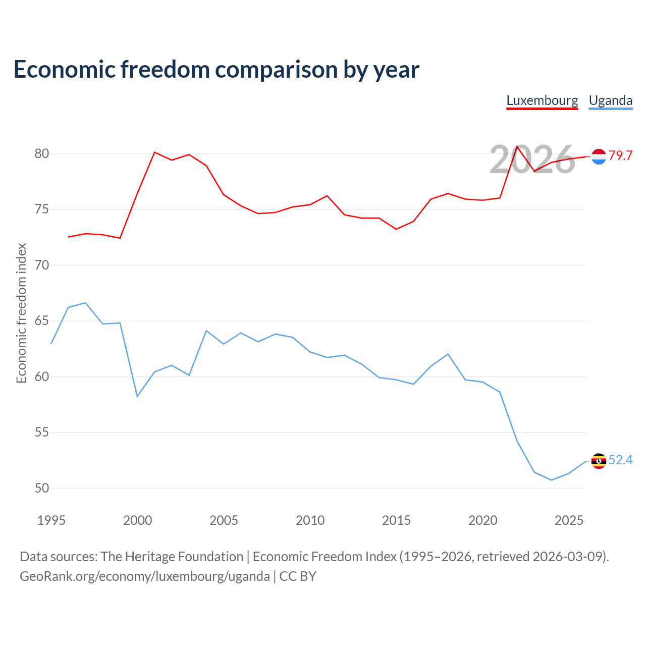 The Economic Freedom Index for Luxembourg is 79.7, ranking 7/197, compared to 52.4 for Uganda, ranking 149/197. The chart above displays a comparison of annual changes in economic freedom indexes.