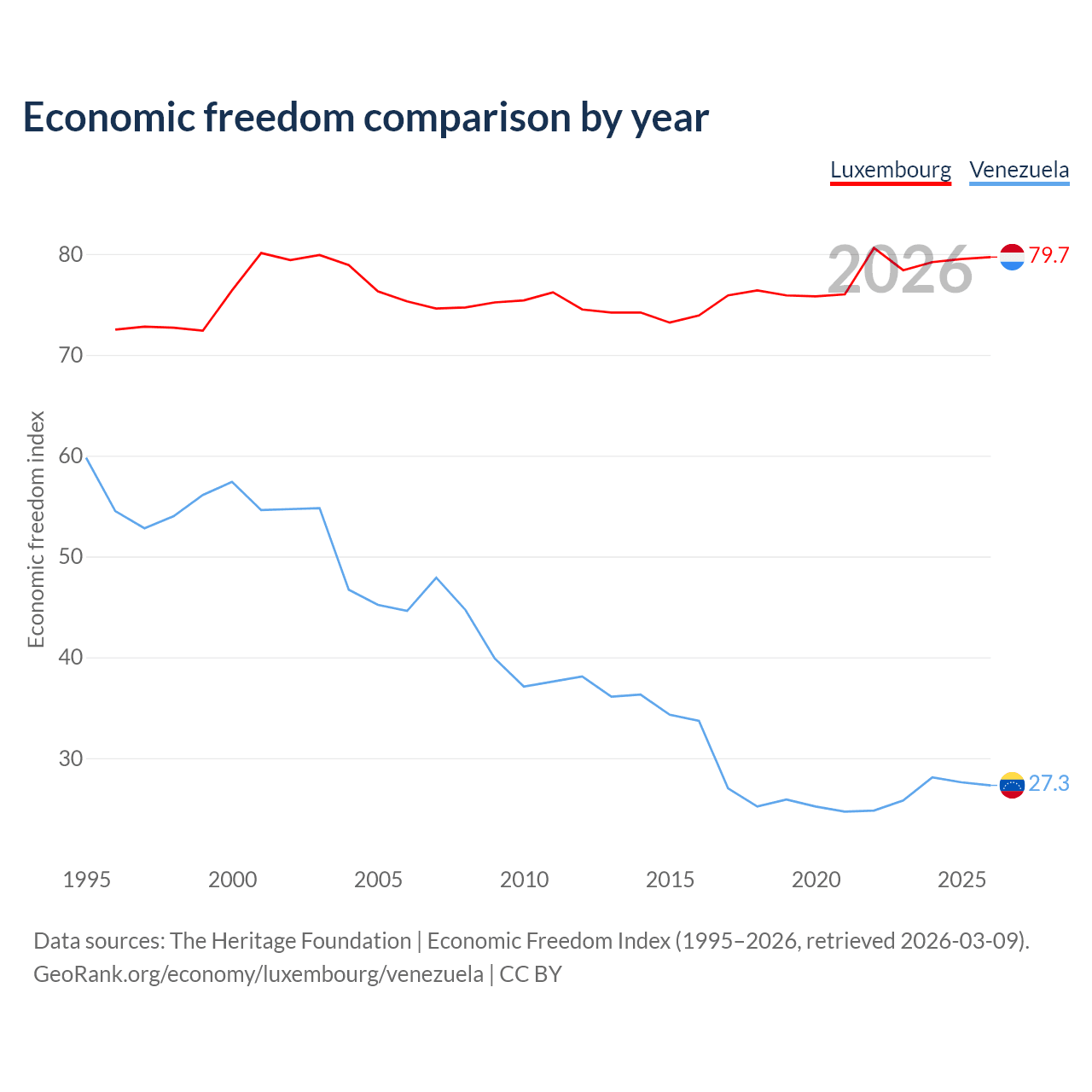 Data sources: The Heritage Foundation | Economic Freedom Index (1995–2026, retrieved 2026-03-09).