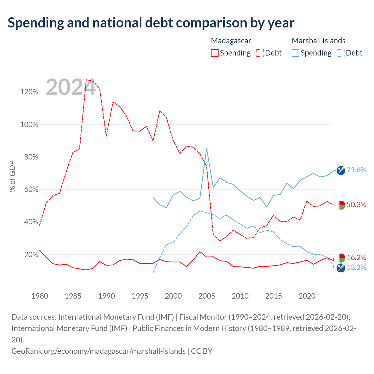 Madagascar has $8.77B in government debt (50.3% of GDP), compared to $38.4M (13.2% of GDP) in the Marshall Islands.