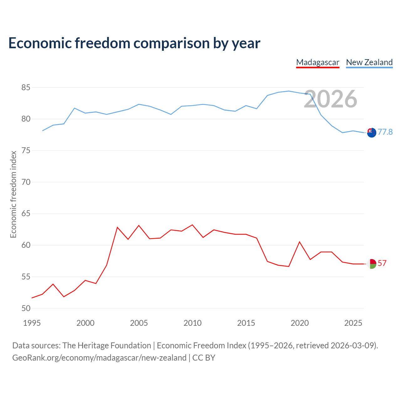 The Economic Freedom Index for Madagascar is 57, ranking 119/197, compared to 77.8 for New Zealand, ranking 13/197. The chart above displays a comparison of annual changes in economic freedom indexes.