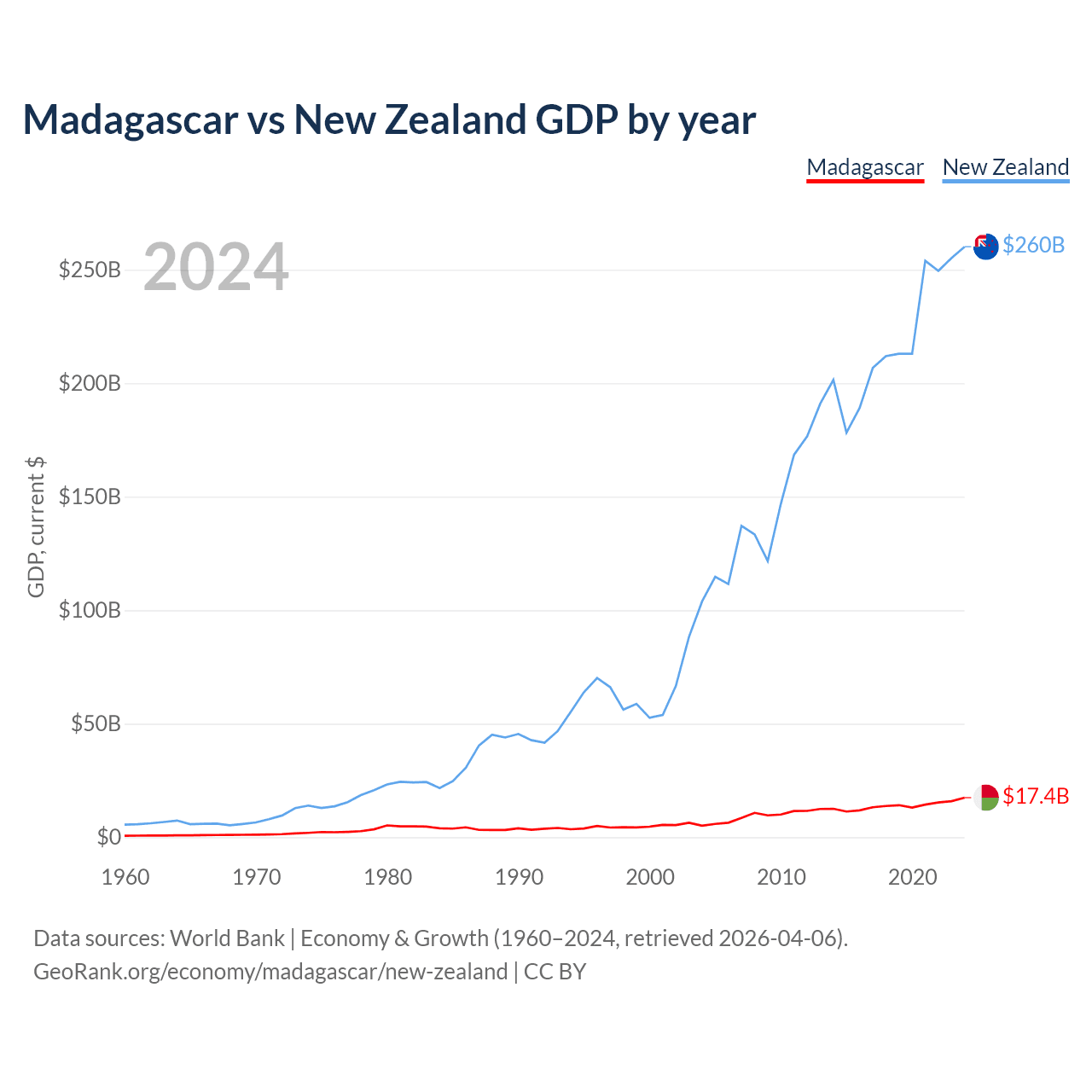 Madagascar has a GDP of $17.4B compared to $260B for New Zealand, ranking 136/197 and 52/197 by economy size, respectively.