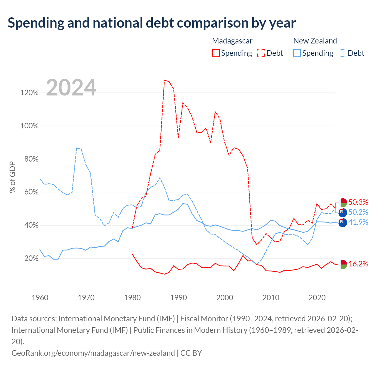 Madagascar has $8.77B in government debt (50.3% of GDP), compared to $131B (50.2% of GDP) in New Zealand.