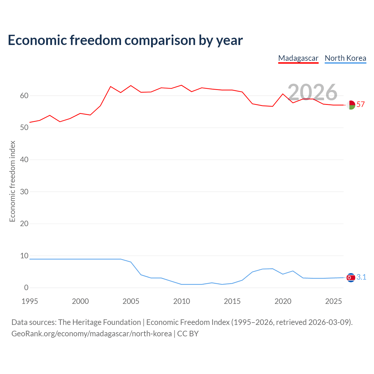 The Economic Freedom Index for Madagascar is 57, ranking 119/197, compared to 3.1 for North Korea, ranking 197/197. The chart above displays a comparison of annual changes in economic freedom indexes.