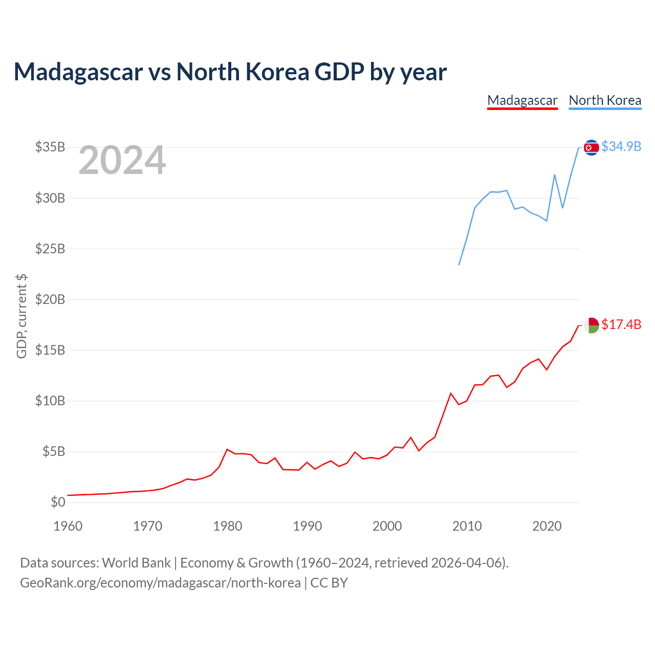 Madagascar has a GDP of $17.4B compared to $34.9B for North Korea, ranking 136/197 and 106/197 by economy size, respectively.