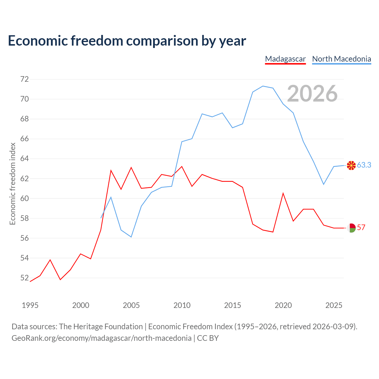 The Economic Freedom Index for Madagascar is 57, ranking 119/197, compared to 63.3 for North Macedonia, ranking 81/197. The chart above displays a comparison of annual changes in economic freedom indexes.