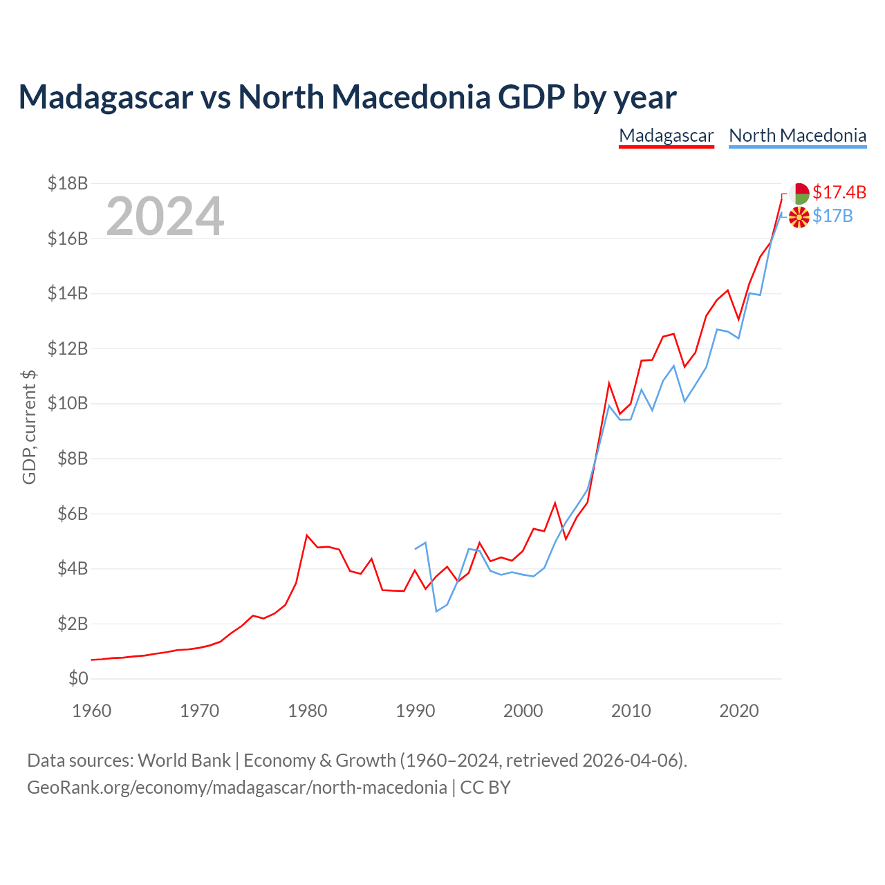 Madagascar has a GDP of $17.4B compared to $17B for North Macedonia, ranking 136/197 and 138/197 by economy size, respectively.