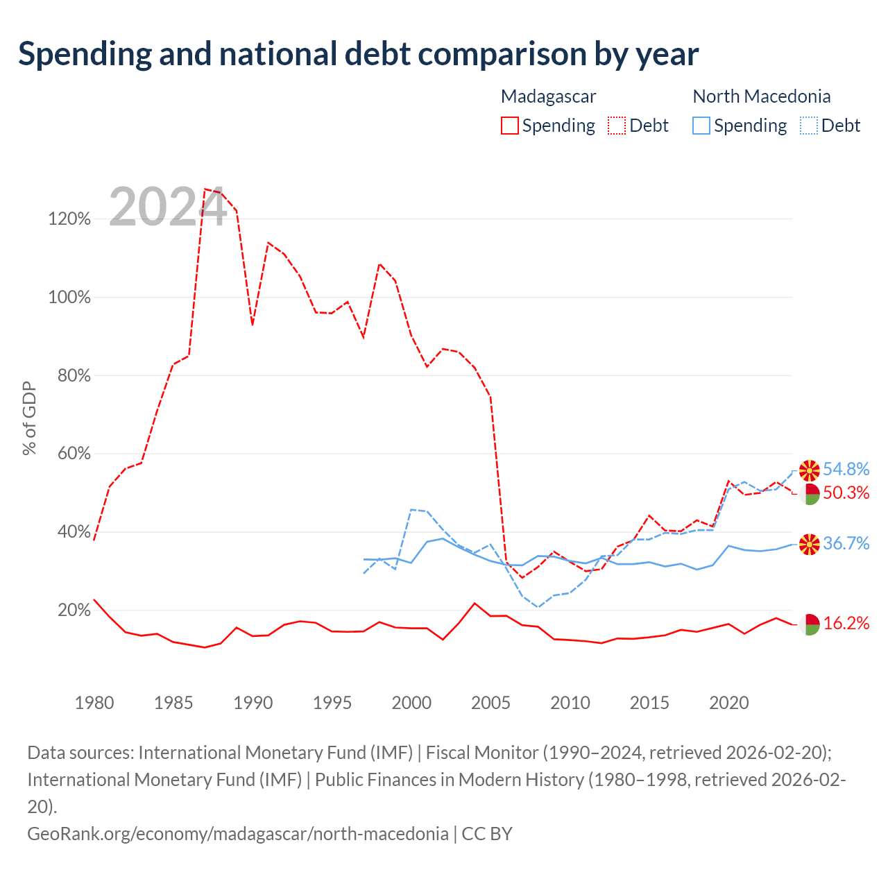 Madagascar has $8.77B in government debt (50.3% of GDP), compared to $9.3B (54.8% of GDP) in North Macedonia.