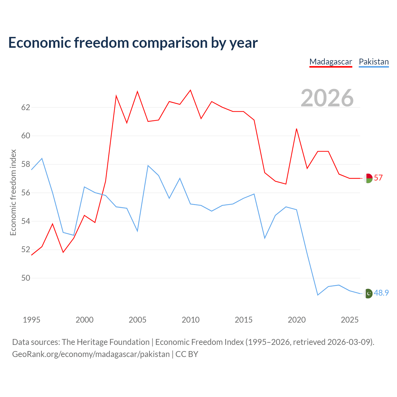 The Economic Freedom Index for Madagascar is 57, ranking 119/197, compared to 48.9 for Pakistan, ranking 168/197. The chart above displays a comparison of annual changes in economic freedom indexes.