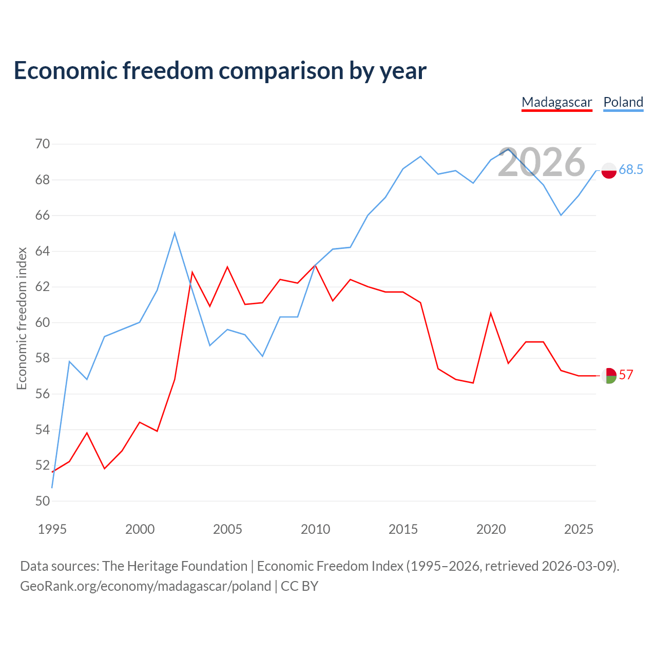 The Economic Freedom Index for Madagascar is 57, ranking 119/197, compared to 68.5 for Poland, ranking 46/197. The chart above displays a comparison of annual changes in economic freedom indexes.