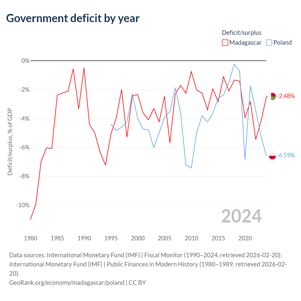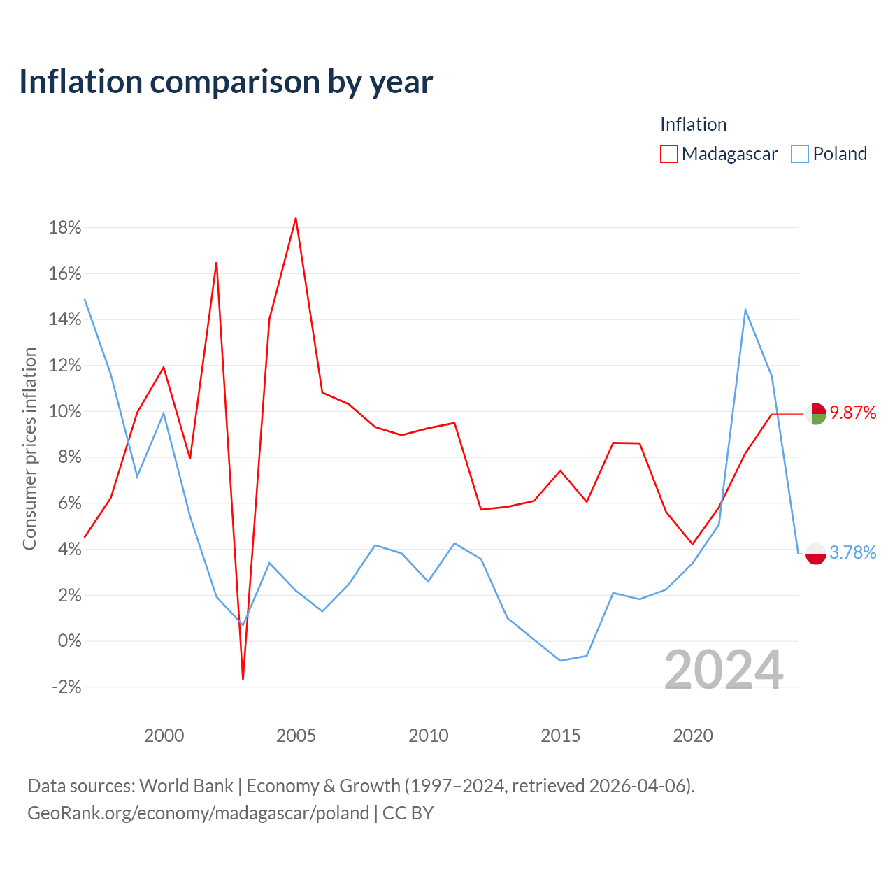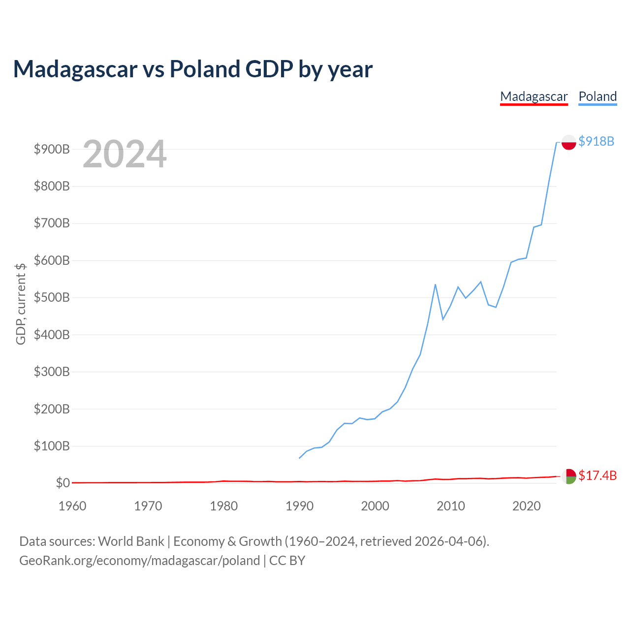 Madagascar has a GDP of $17.4B compared to $918B for Poland, ranking 136/197 and 21/197 by economy size, respectively.