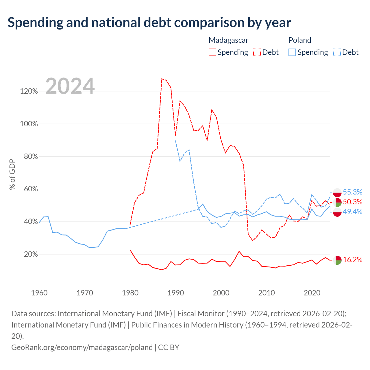 Madagascar has $8.77B in government debt (50.3% of GDP), compared to $507B (55.3% of GDP) in Poland.
