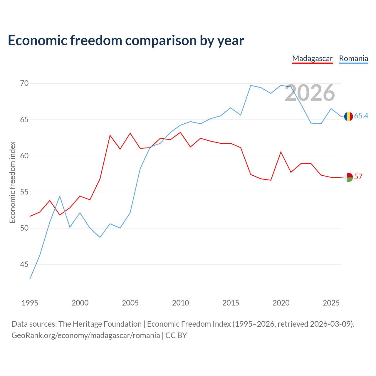 The Economic Freedom Index for Madagascar is 57, ranking 119/197, compared to 65.4 for Romania, ranking 64/197. The chart above displays a comparison of annual changes in economic freedom indexes.
