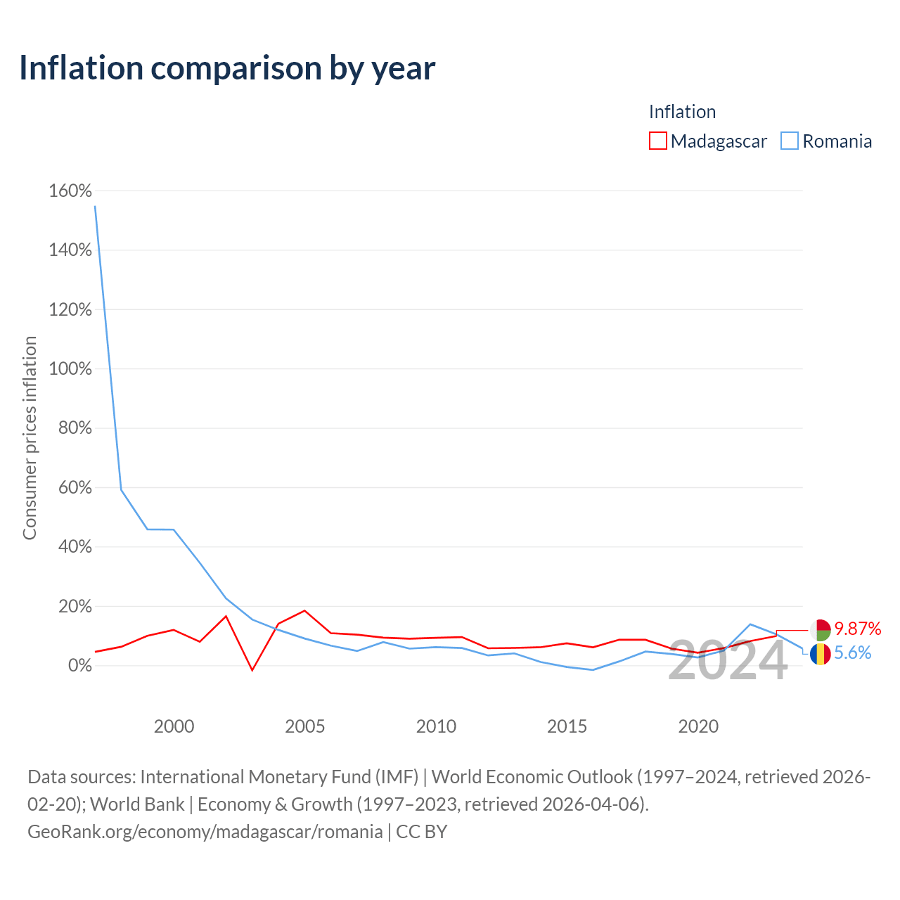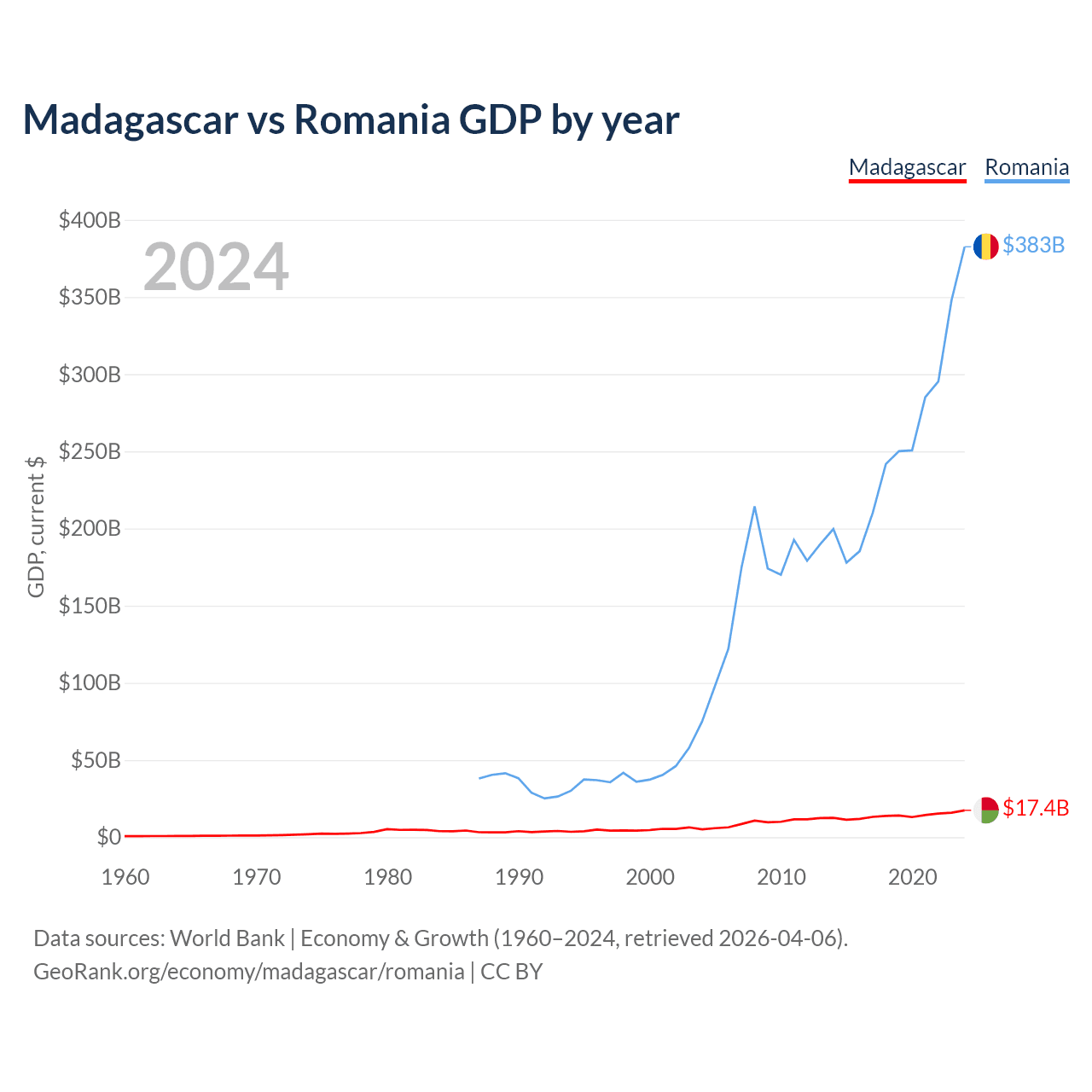 Madagascar has a GDP of $17.4B compared to $383B for Romania, ranking 136/197 and 42/197 by economy size, respectively.
