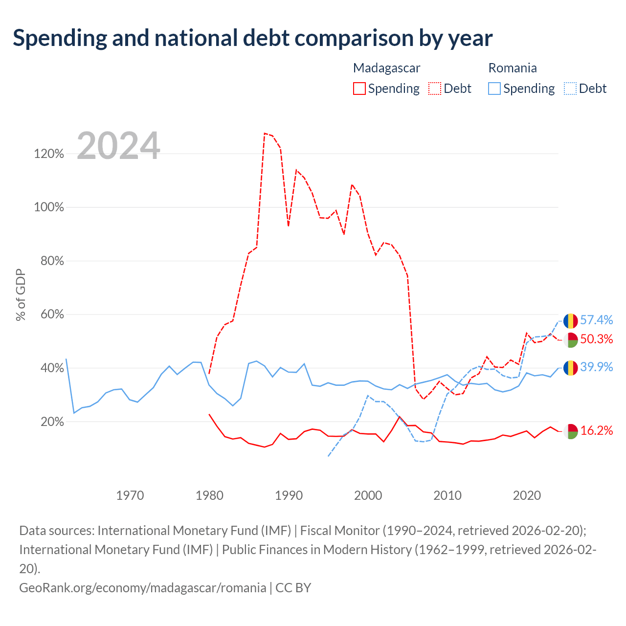 Madagascar has $8.77B in government debt (50.3% of GDP), compared to $220B (57.4% of GDP) in Romania.