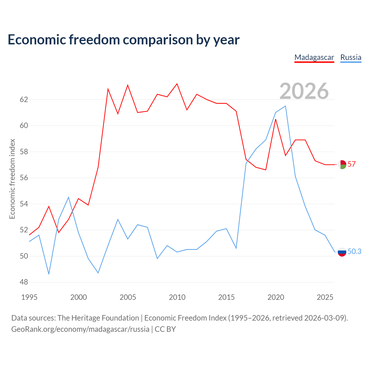 The Economic Freedom Index for Madagascar is 57, ranking 119/197, compared to 50.3 for Russia, ranking 161/197. The chart above displays a comparison of annual changes in economic freedom indexes.