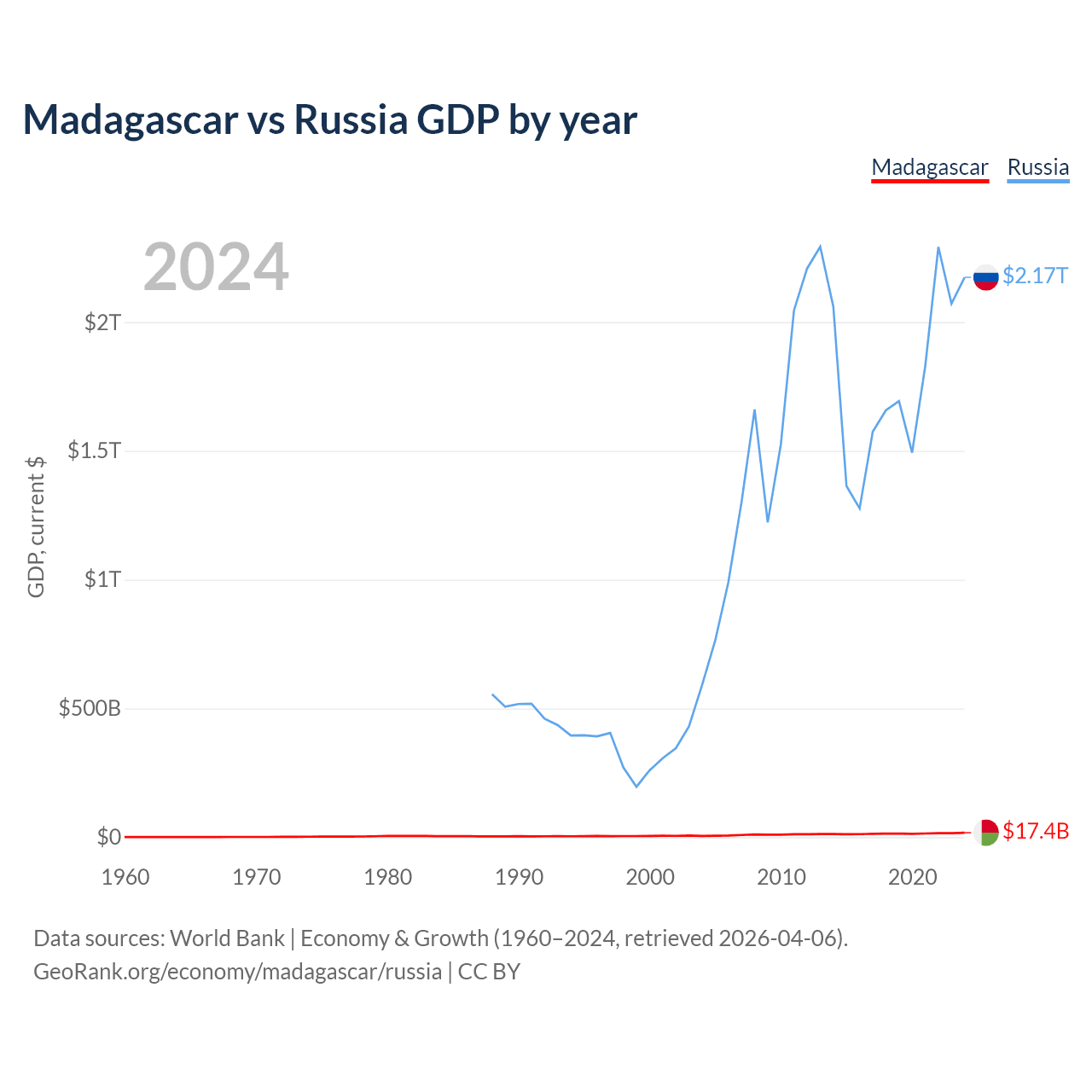 Madagascar has a GDP of $17.4B compared to $2.17T for Russia, ranking 136/197 and 11/197 by economy size, respectively.