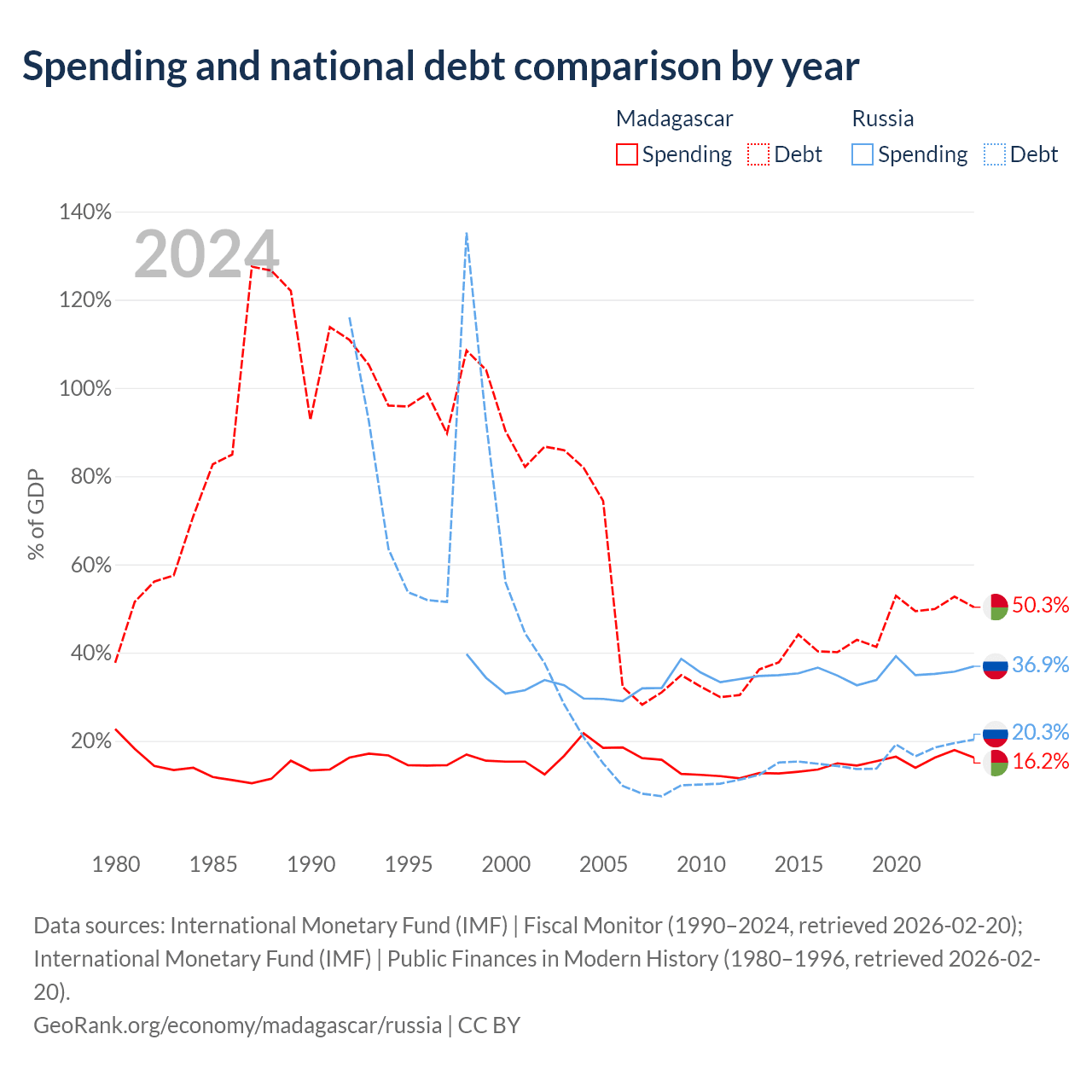 Madagascar has $8.77B in government debt (50.3% of GDP), compared to $440B (20.3% of GDP) in Russia.