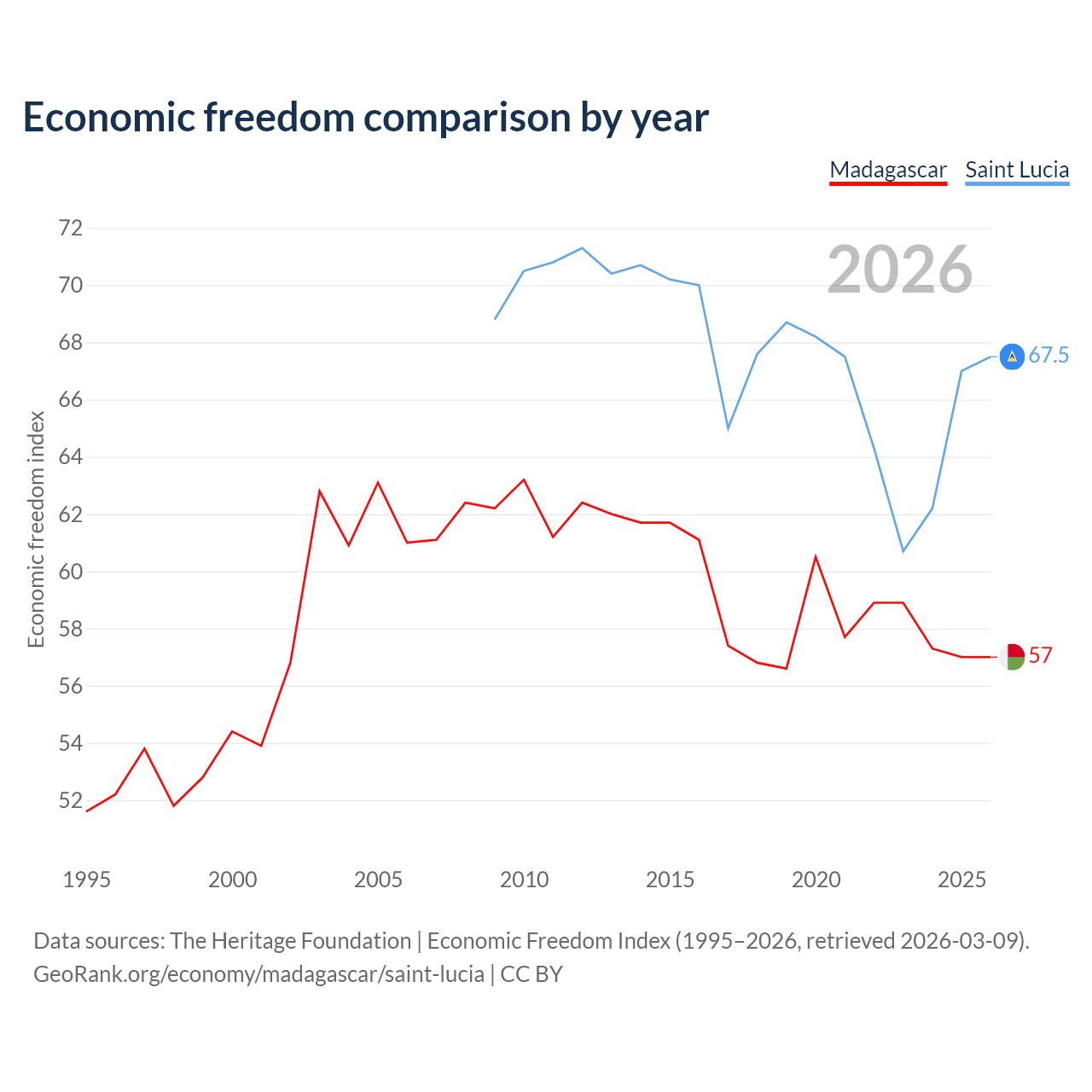 The Economic Freedom Index for Madagascar is 57, ranking 119/197, compared to 67.5 for Saint Lucia, ranking 57/197. The chart above displays a comparison of annual changes in economic freedom indexes.