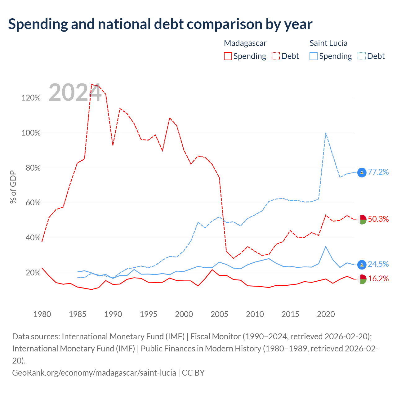 Madagascar has $8.77B in government debt (50.3% of GDP), compared to $1.97B (77.2% of GDP) in Saint Lucia.