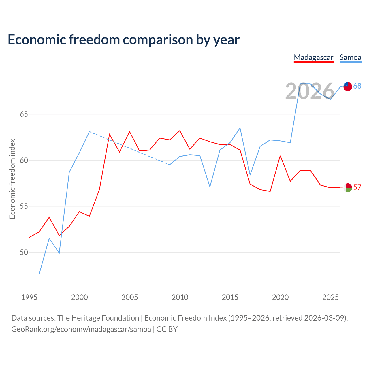 The Economic Freedom Index for Madagascar is 57, ranking 119/197, compared to 68 for Samoa, ranking 52/197. The chart above displays a comparison of annual changes in economic freedom indexes.