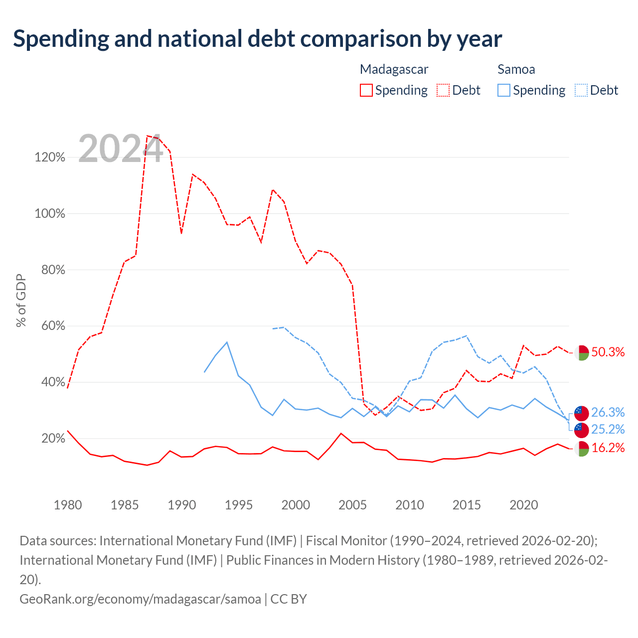 Madagascar has $8.77B in government debt (50.3% of GDP), compared to $296M (25.2% of GDP) in Samoa.