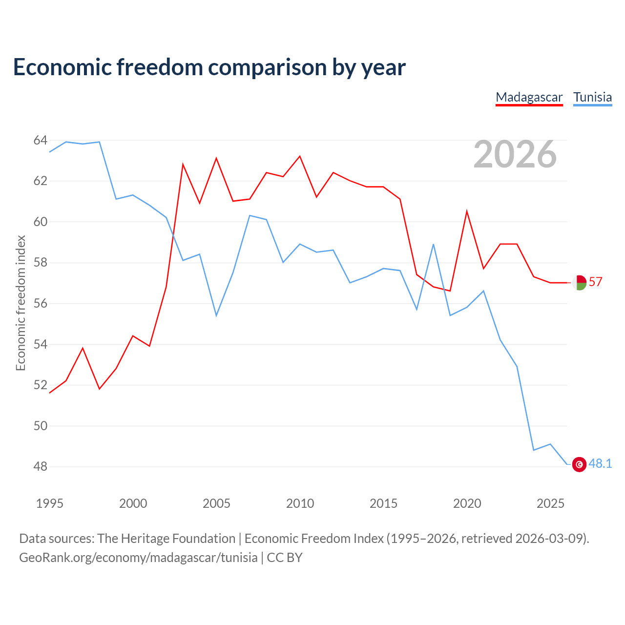 The Economic Freedom Index for Madagascar is 57, ranking 119/197, compared to 48.1 for Tunisia, ranking 172/197. The chart above displays a comparison of annual changes in economic freedom indexes.