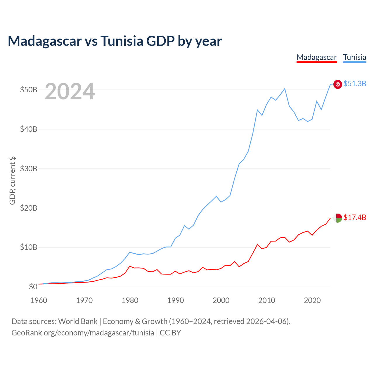 Madagascar has a GDP of $17.4B compared to $51.3B for Tunisia, ranking 136/197 and 93/197 by economy size, respectively.