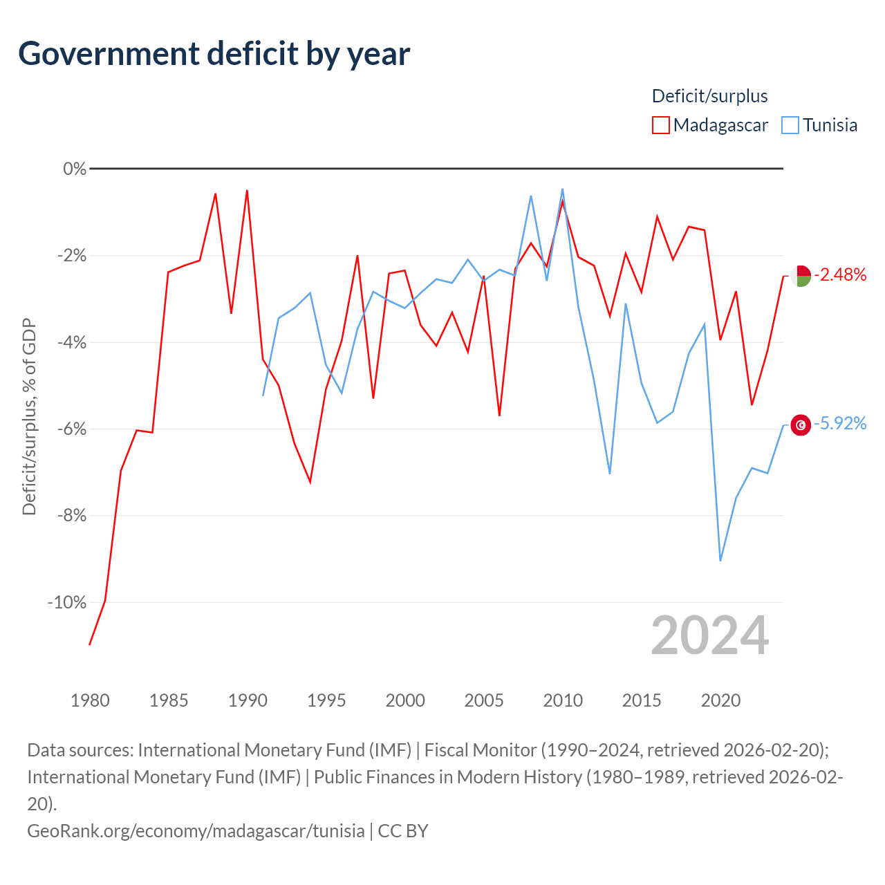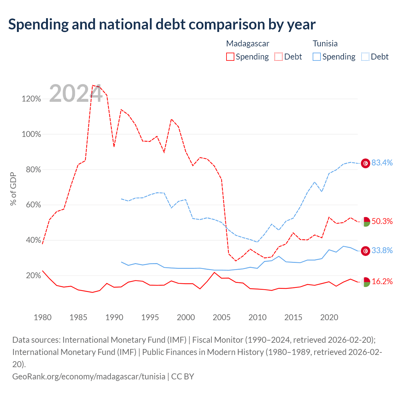 Madagascar has $8.77B in government debt (50.3% of GDP), compared to $42.8B (83.4% of GDP) in Tunisia.