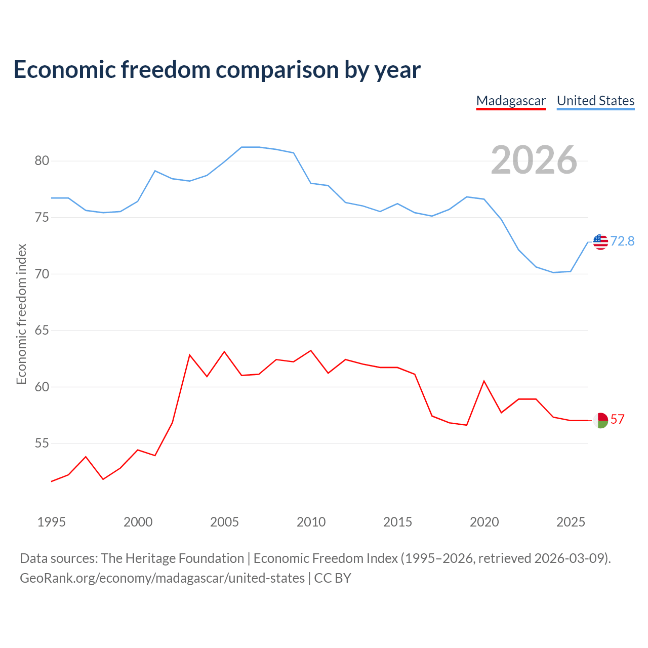 The Economic Freedom Index for Madagascar is 57, ranking 119/197, compared to 72.8 for the United States, ranking 27/197. The chart above displays a comparison of annual changes in economic freedom indexes.