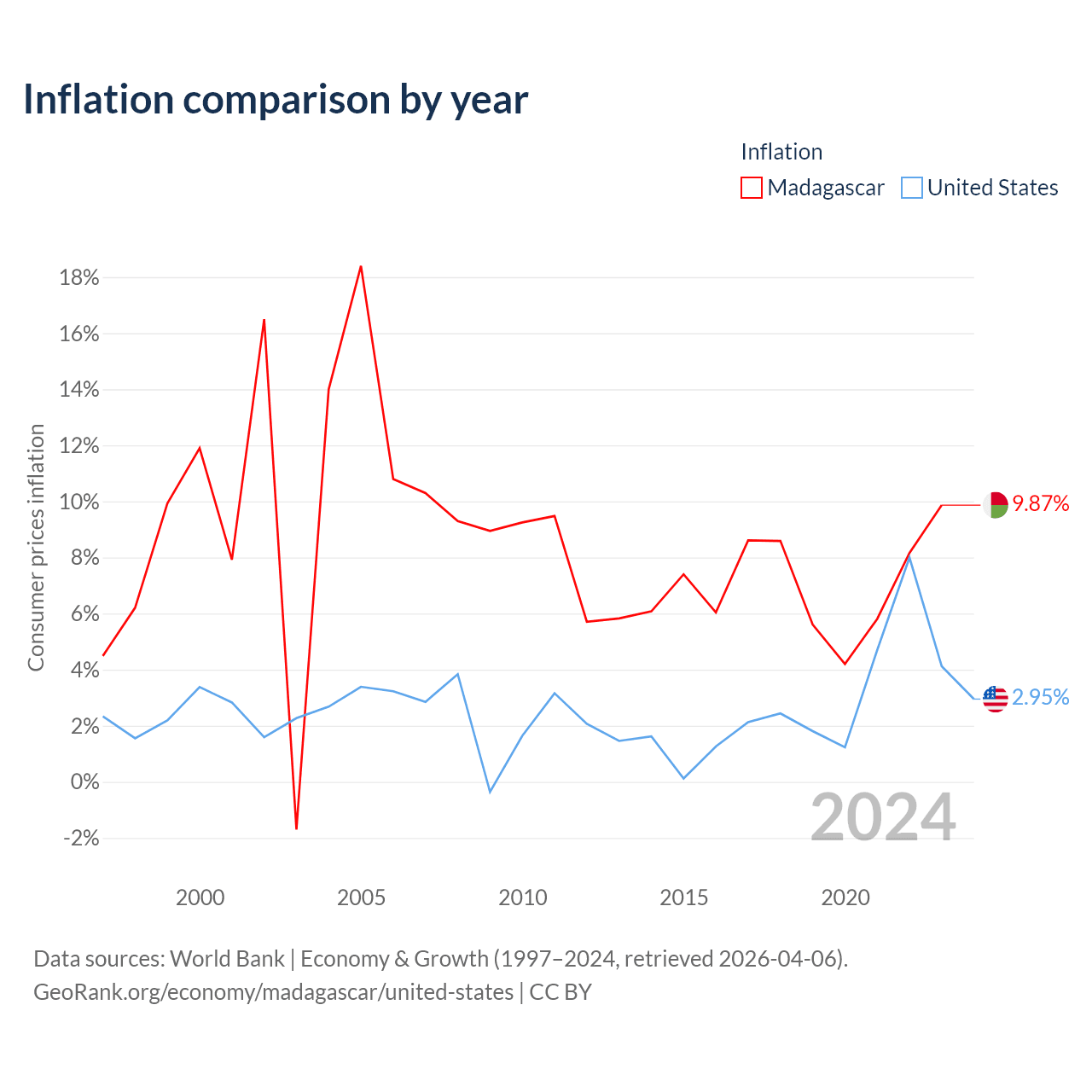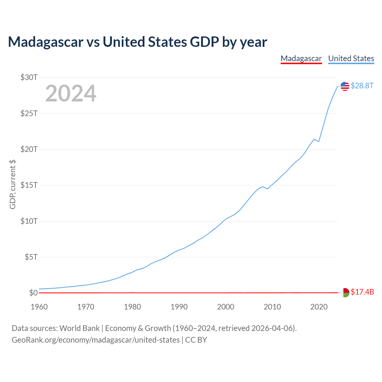 Madagascar has a GDP of $17.4B compared to $28.8T for the United States, ranking 136/197 and 1/197 by economy size, respectively.