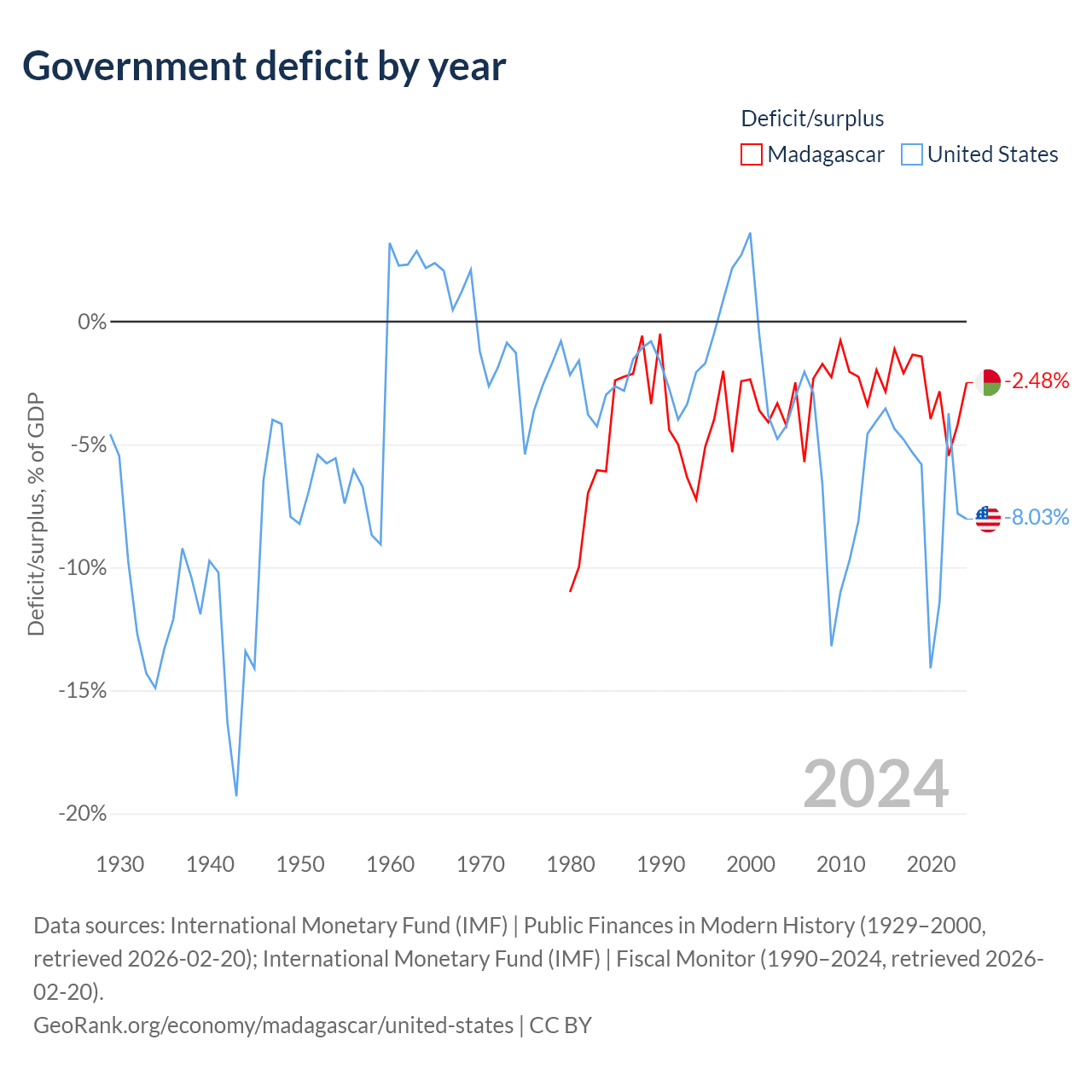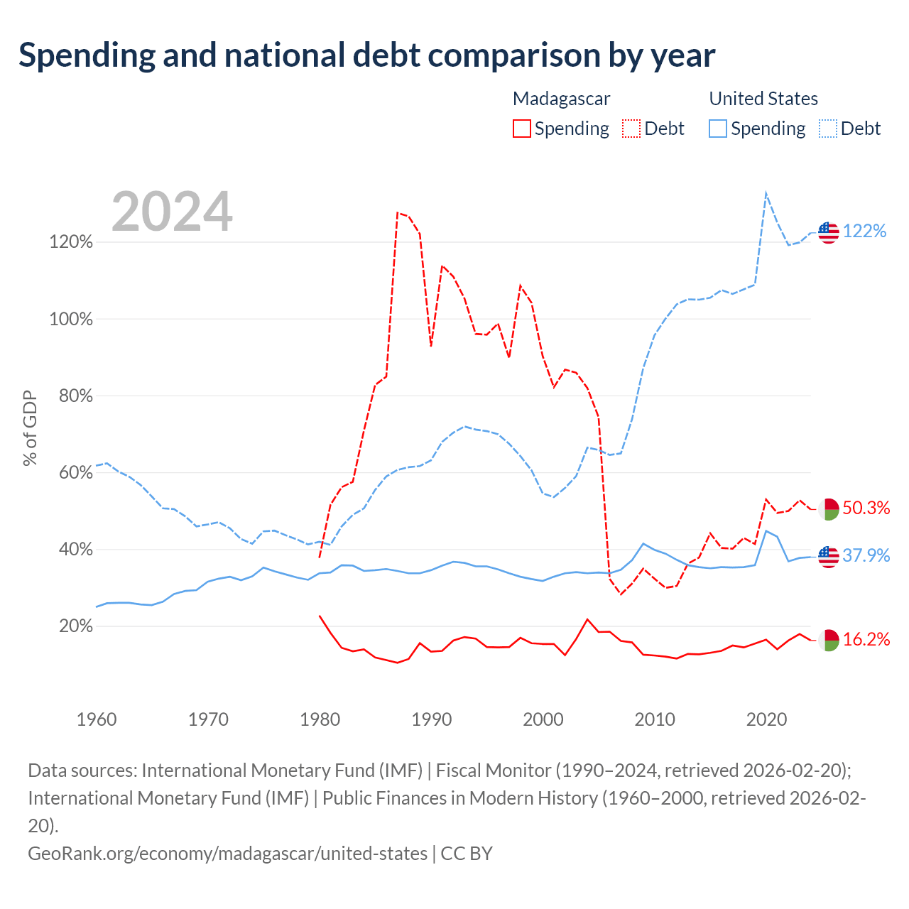 Madagascar has $8.77B in government debt (50.3% of GDP), compared to $35.2T (122.3% of GDP) in the United States.