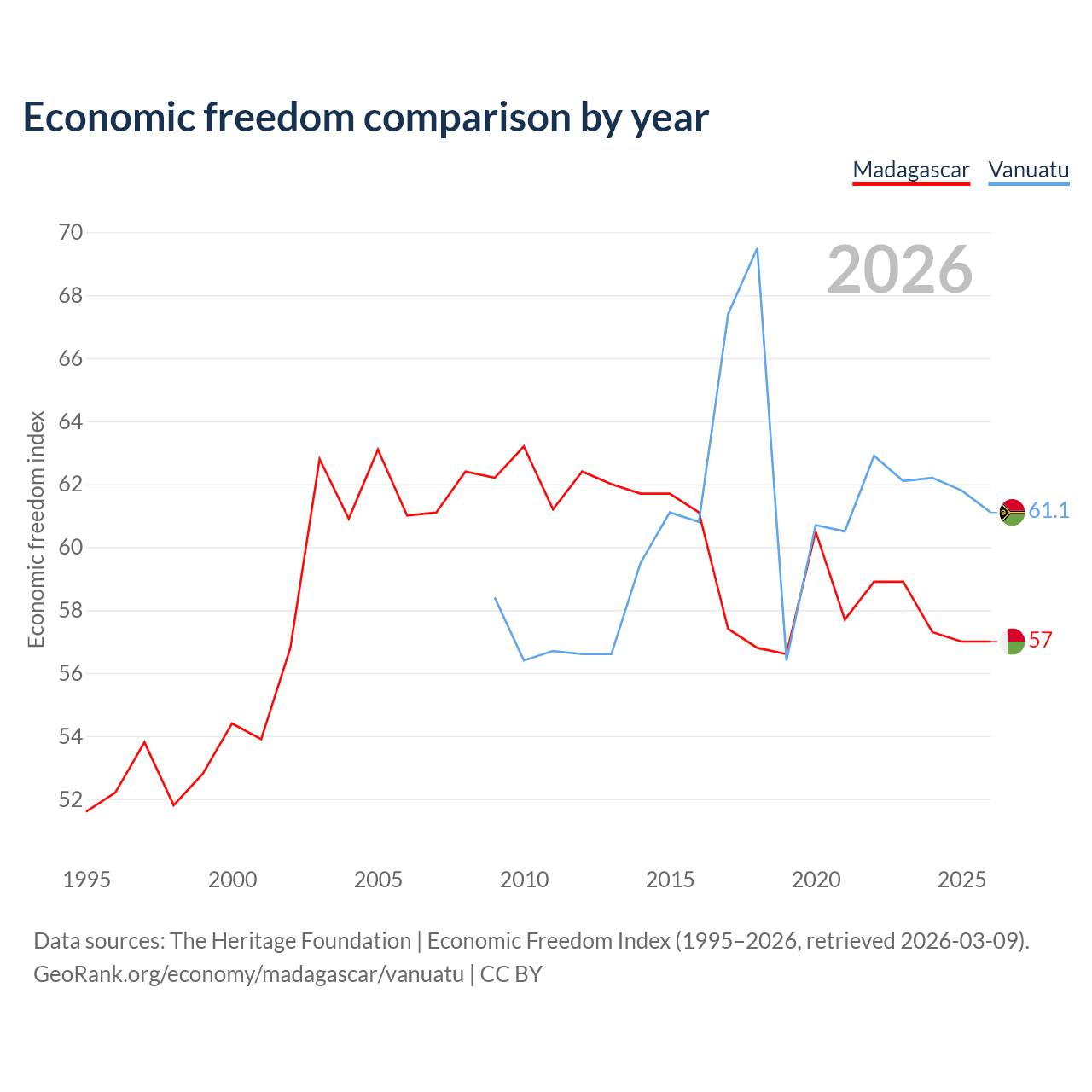 The Economic Freedom Index for Madagascar is 57, ranking 119/197, compared to 61.1 for Vanuatu, ranking 92/197. The chart above displays a comparison of annual changes in economic freedom indexes.