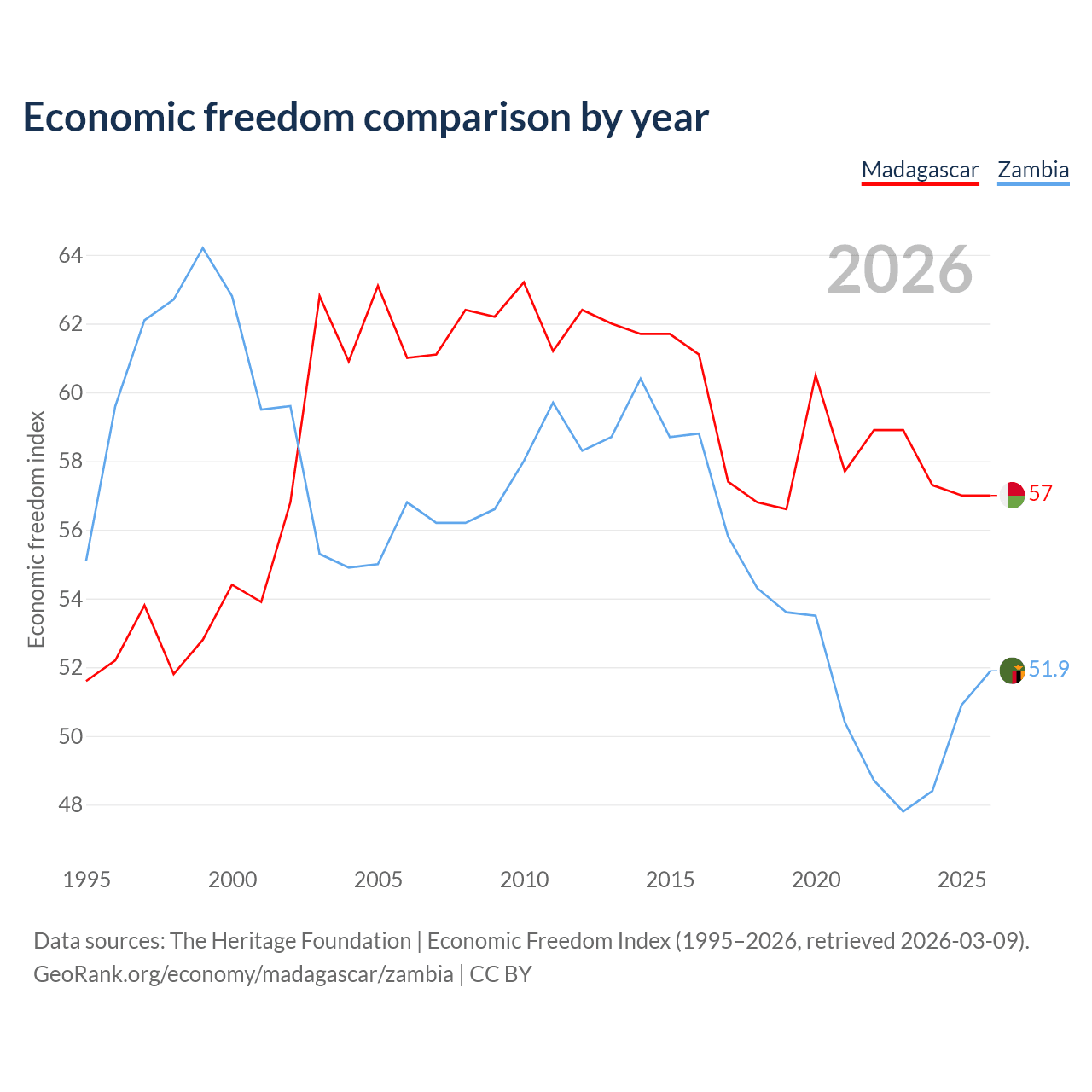 The Economic Freedom Index for Madagascar is 57, ranking 119/197, compared to 51.9 for Zambia, ranking 152/197. The chart above displays a comparison of annual changes in economic freedom indexes.