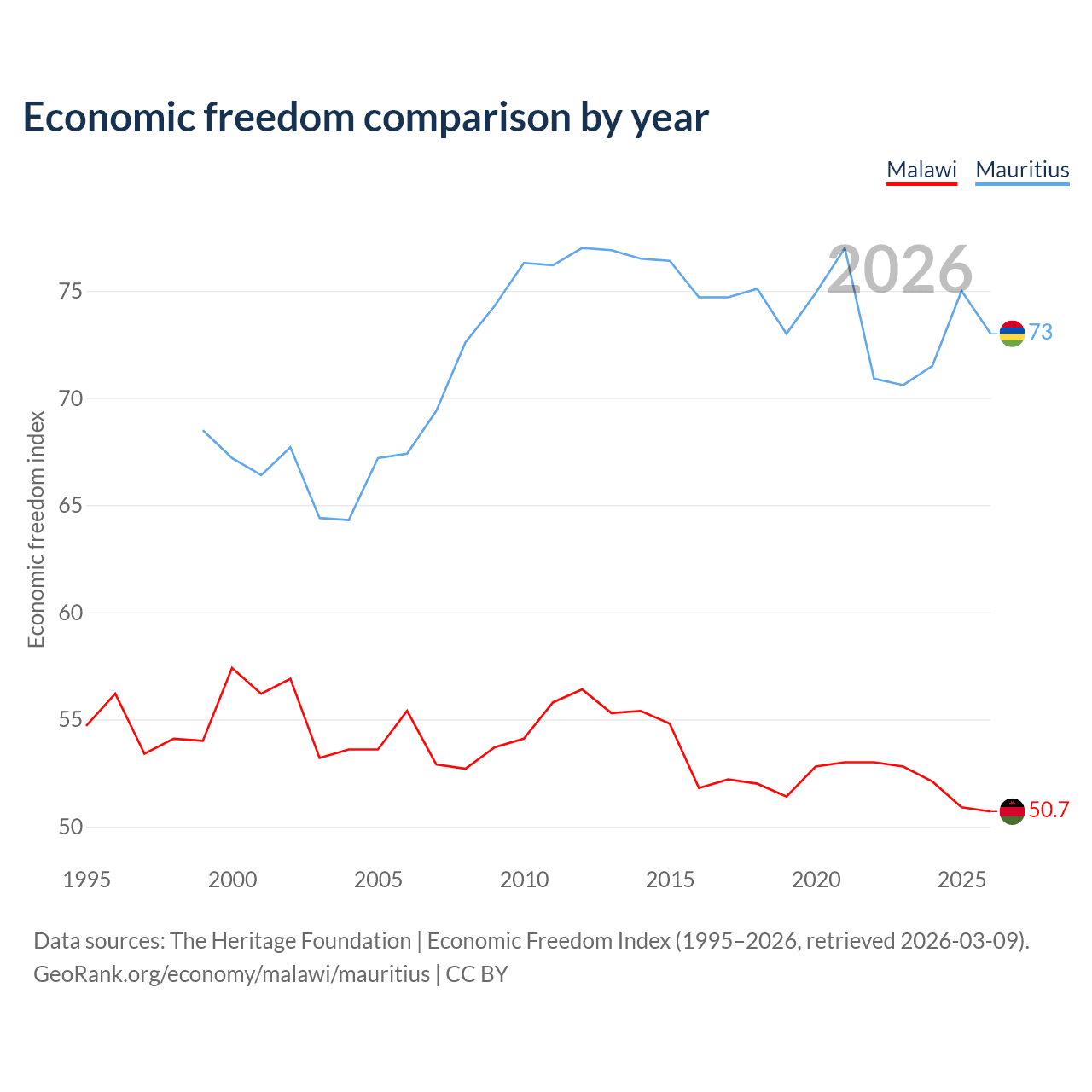The Economic Freedom Index for Malawi is 50.7, ranking 159/197, compared to 73 for Mauritius, ranking 26/197. The chart above displays a comparison of annual changes in economic freedom indexes.