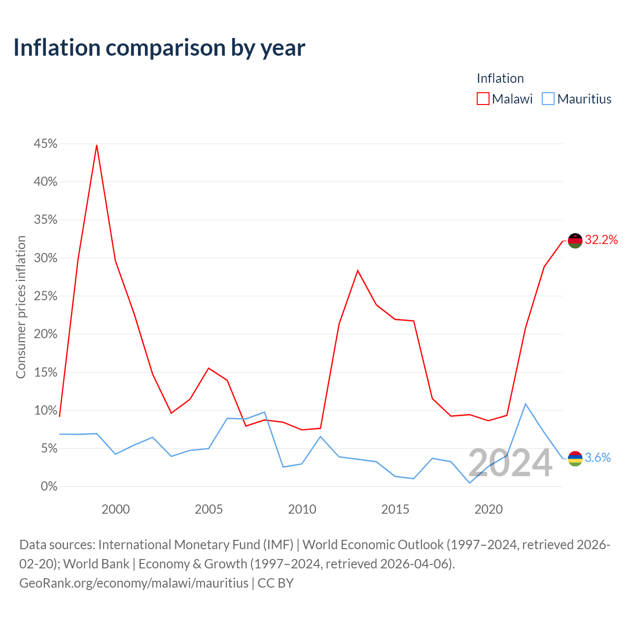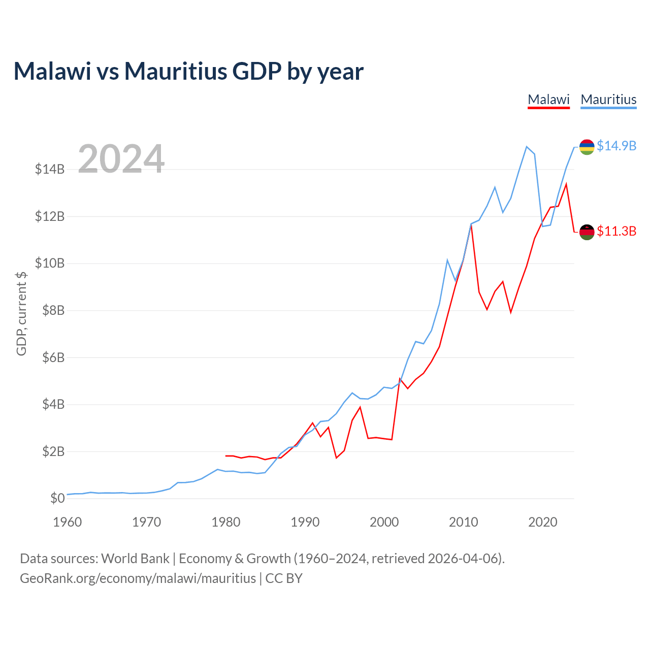 Malawi has a GDP of $11.3B compared to $14.9B for Mauritius, ranking 151/197 and 143/197 by economy size, respectively.