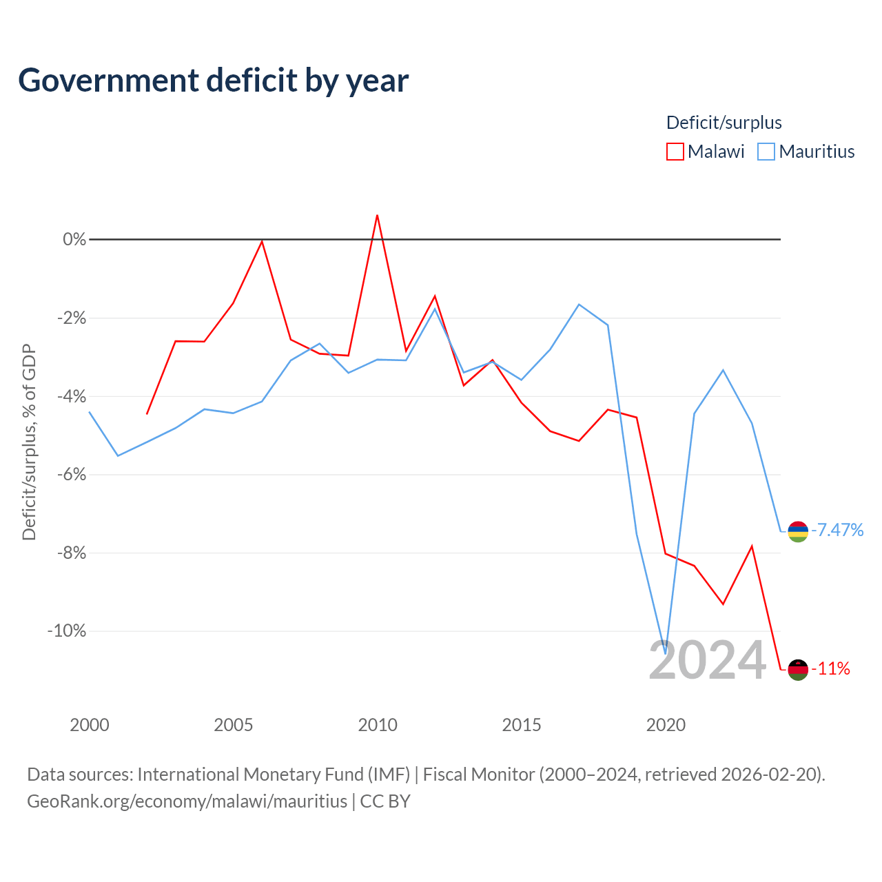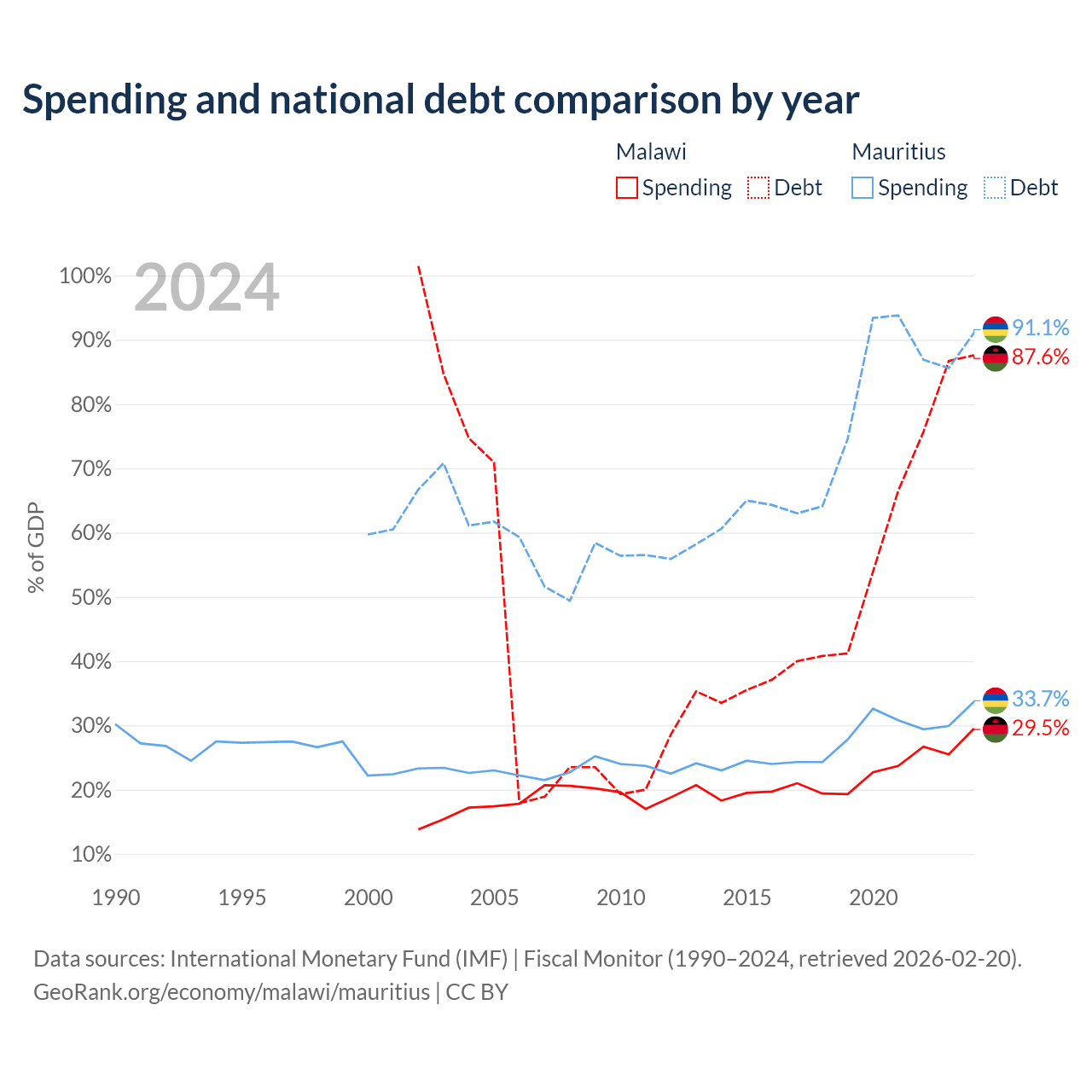 Malawi has $9.91B in government debt (87.6% of GDP), compared to $13.6B (91.1% of GDP) in Mauritius.