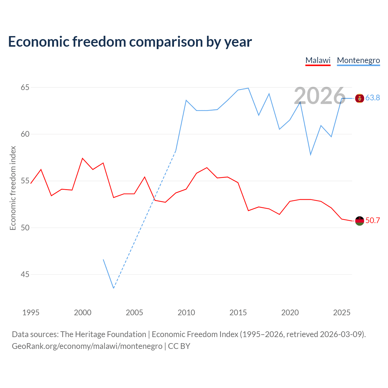 The Economic Freedom Index for Malawi is 50.7, ranking 159/197, compared to 63.8 for Montenegro, ranking 78/197. The chart above displays a comparison of annual changes in economic freedom indexes.