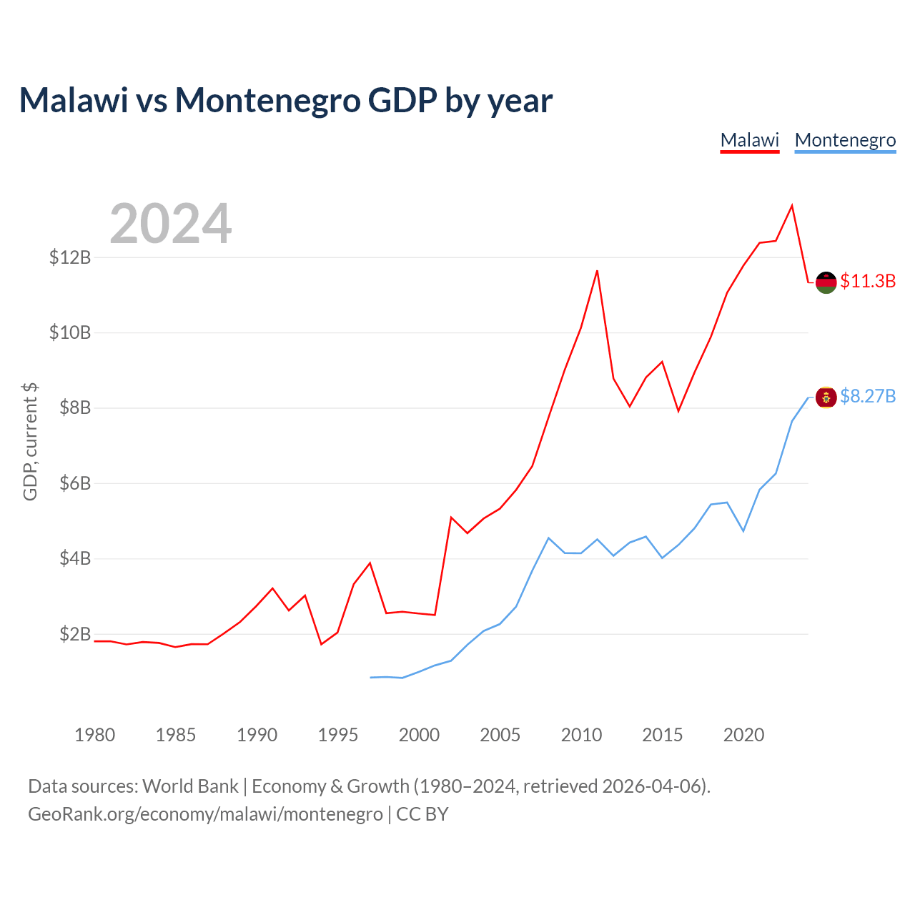 Malawi has a GDP of $11.3B compared to $8.27B for Montenegro, ranking 151/197 and 155/197 by economy size, respectively.