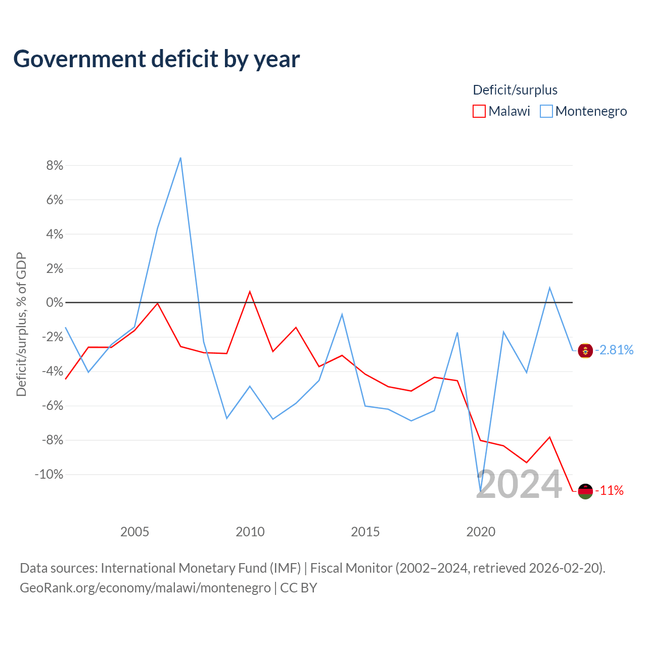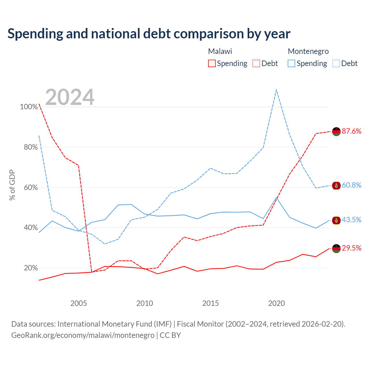 Malawi has $9.91B in government debt (87.6% of GDP), compared to $5.02B (60.8% of GDP) in Montenegro.