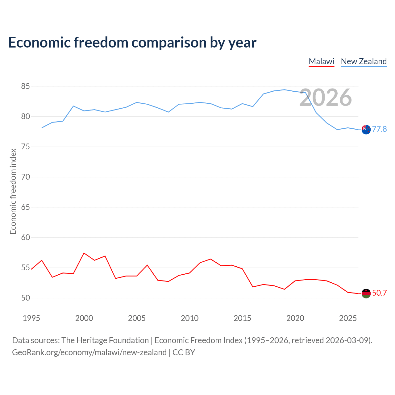 The Economic Freedom Index for Malawi is 50.7, ranking 159/197, compared to 77.8 for New Zealand, ranking 13/197. The chart above displays a comparison of annual changes in economic freedom indexes.