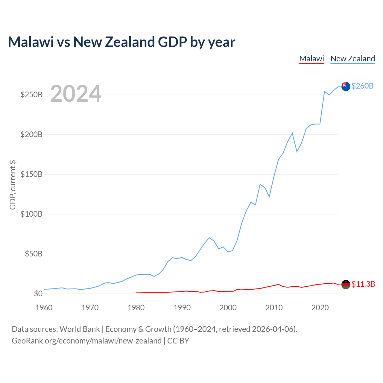 Malawi has a GDP of $11.3B compared to $260B for New Zealand, ranking 151/197 and 52/197 by economy size, respectively.