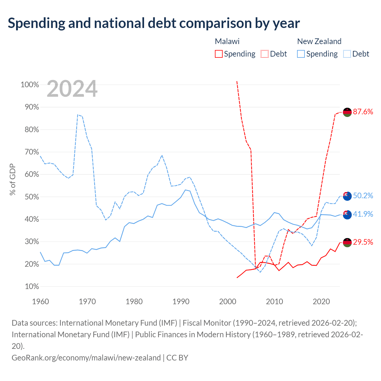 Malawi has $9.91B in government debt (87.6% of GDP), compared to $131B (50.2% of GDP) in New Zealand.