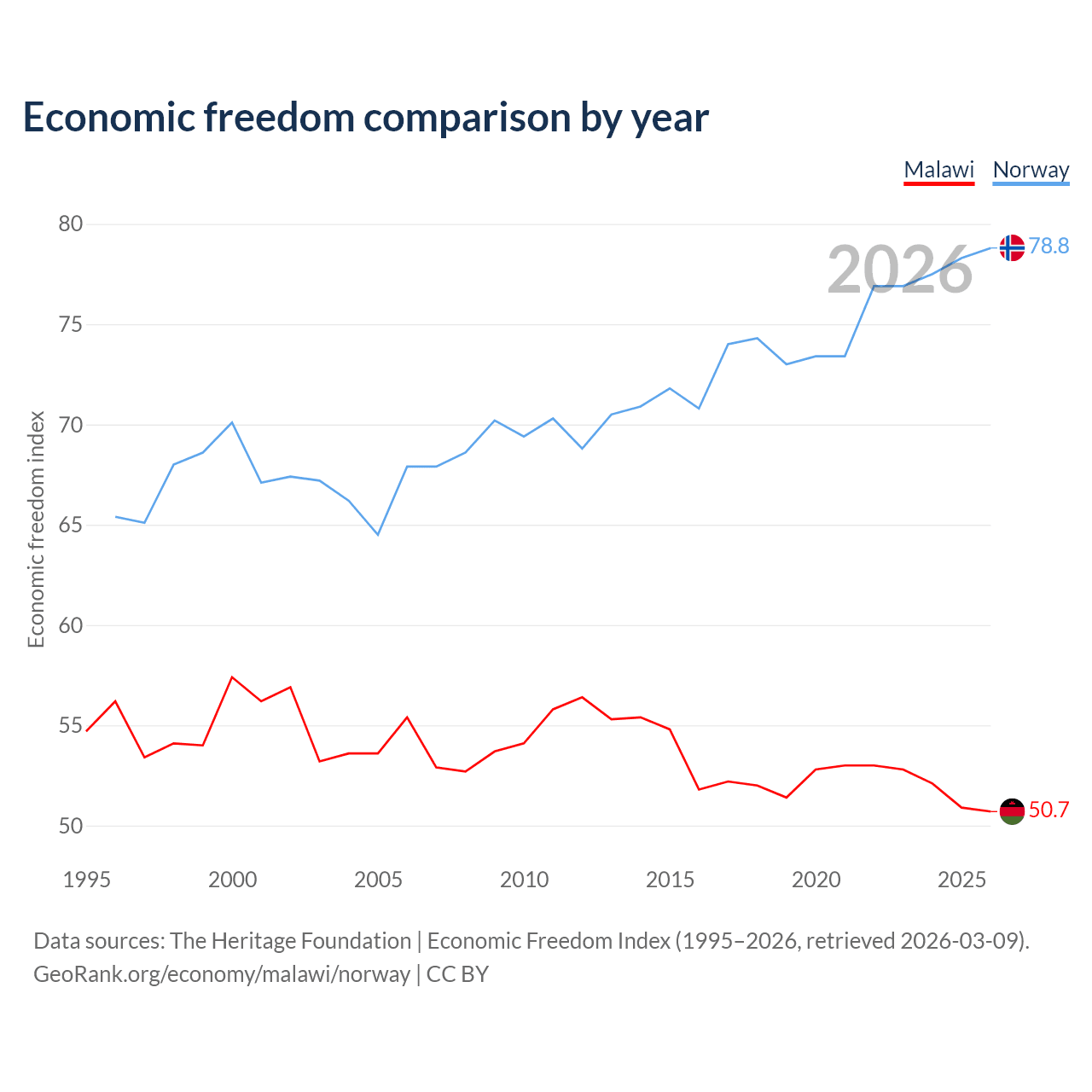 The Economic Freedom Index for Malawi is 50.7, ranking 159/197, compared to 78.8 for Norway, ranking 9/197. The chart above displays a comparison of annual changes in economic freedom indexes.