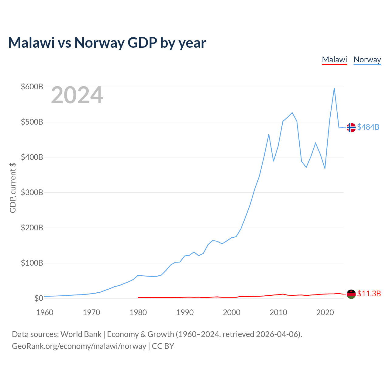 Malawi has a GDP of $11.3B compared to $484B for Norway, ranking 151/197 and 32/197 by economy size, respectively.