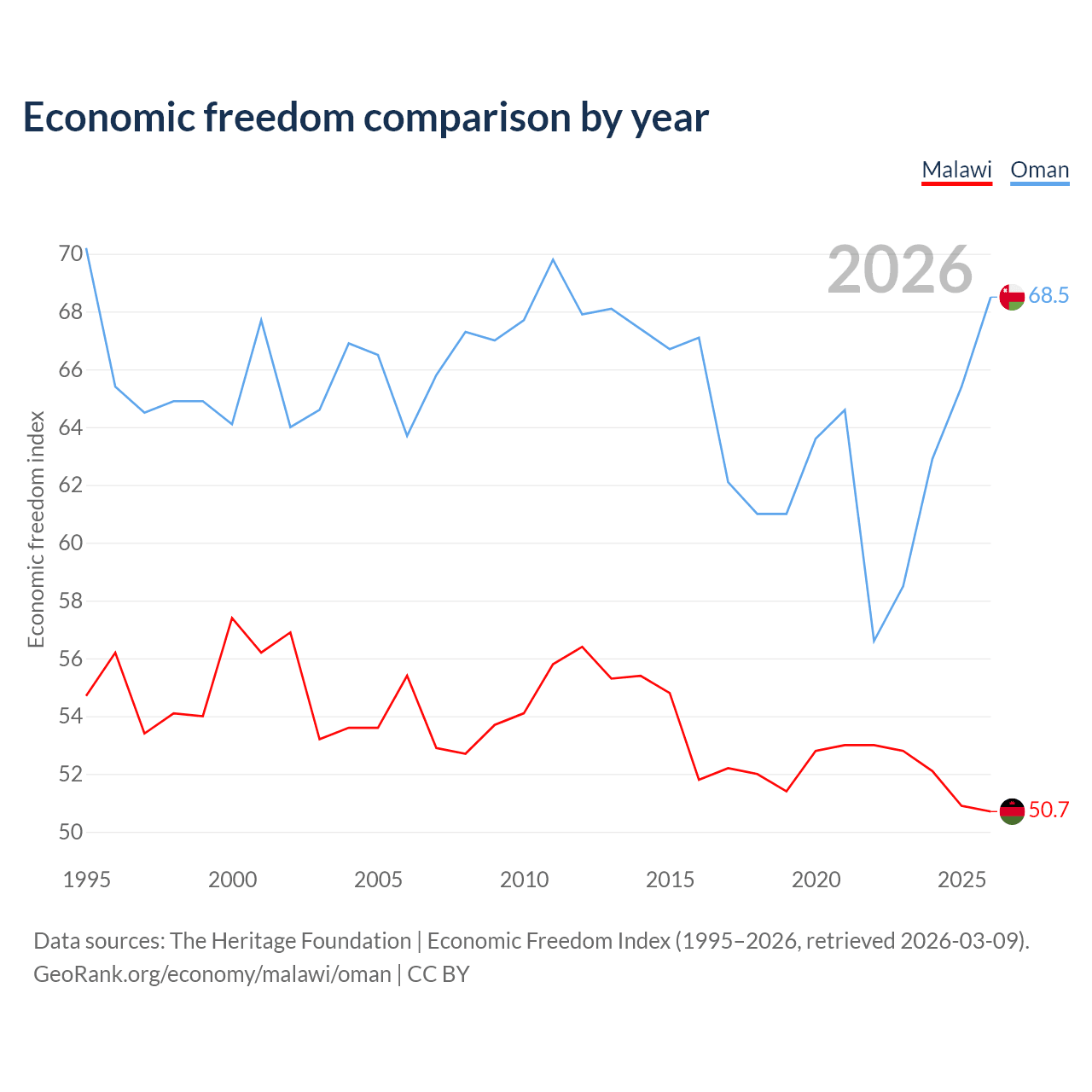 The Economic Freedom Index for Malawi is 50.7, ranking 159/197, compared to 68.5 for Oman, ranking 45/197. The chart above displays a comparison of annual changes in economic freedom indexes.