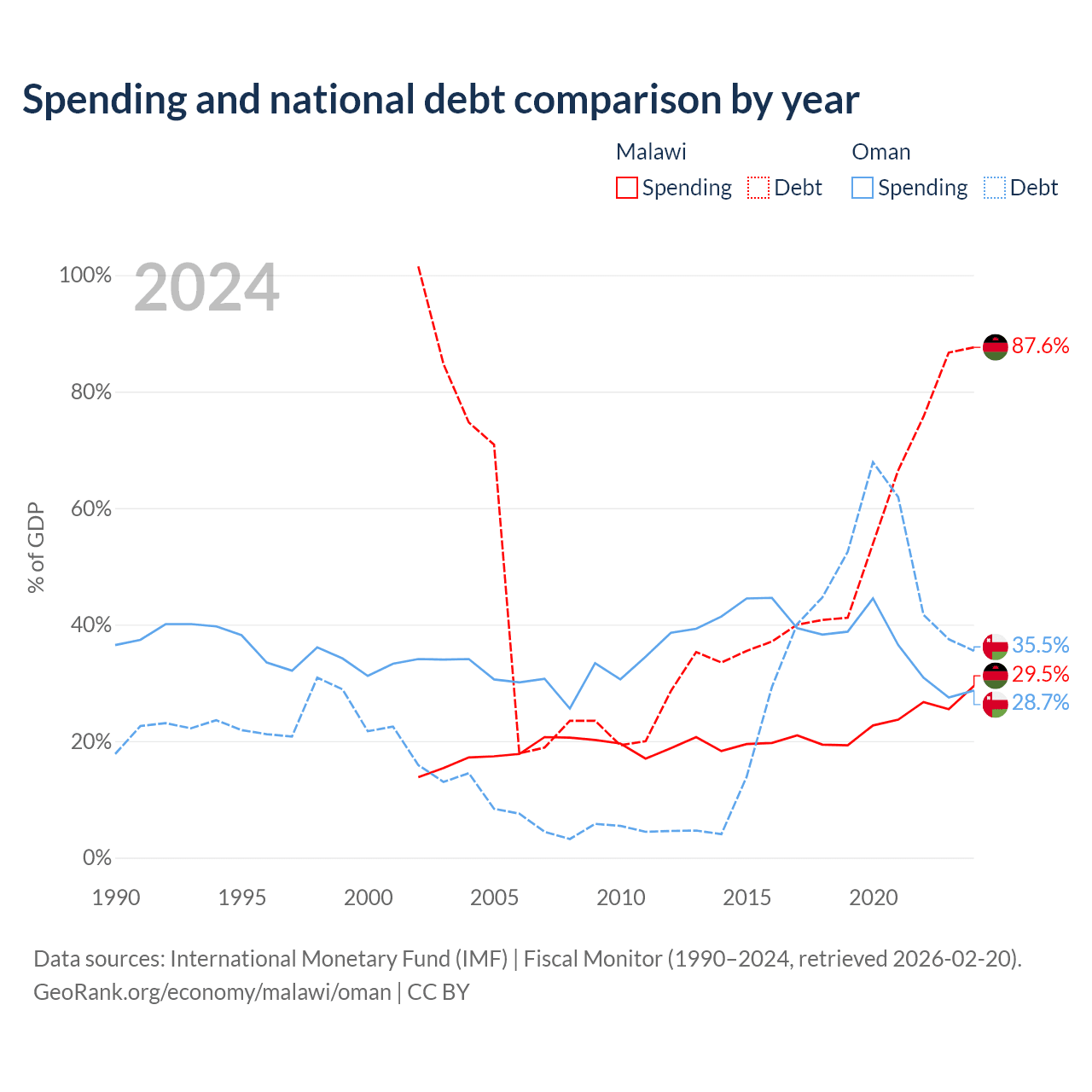 Malawi has $9.91B in government debt (87.6% of GDP), compared to $38B (35.5% of GDP) in Oman.
