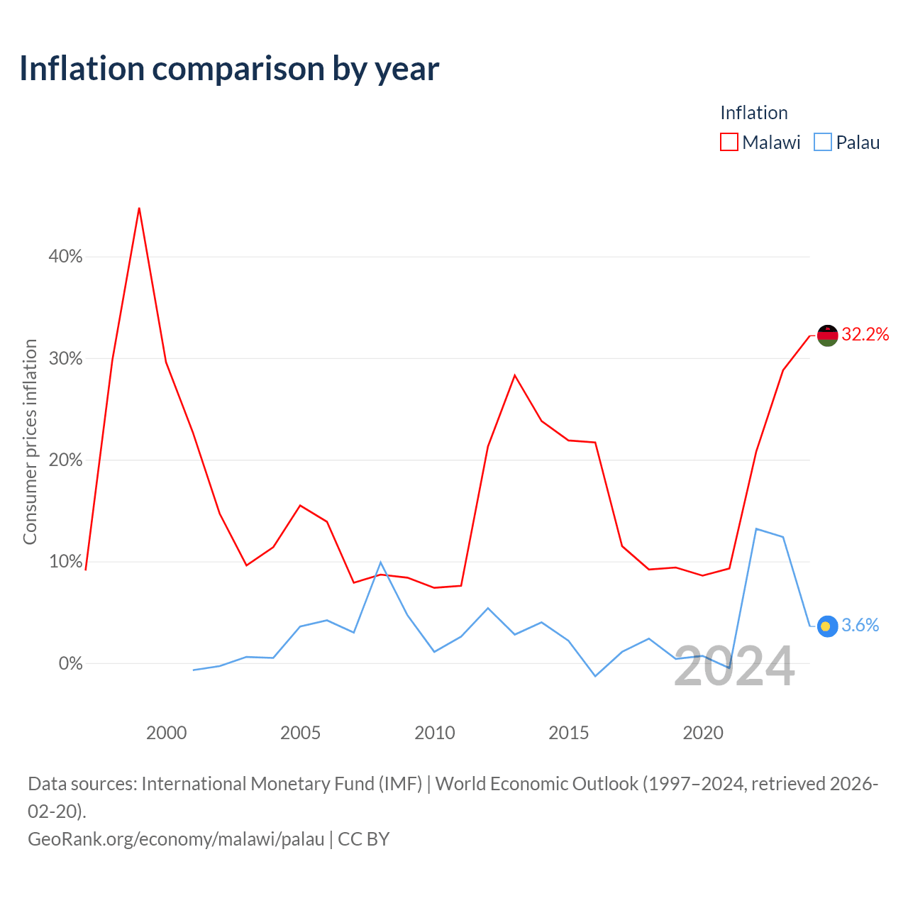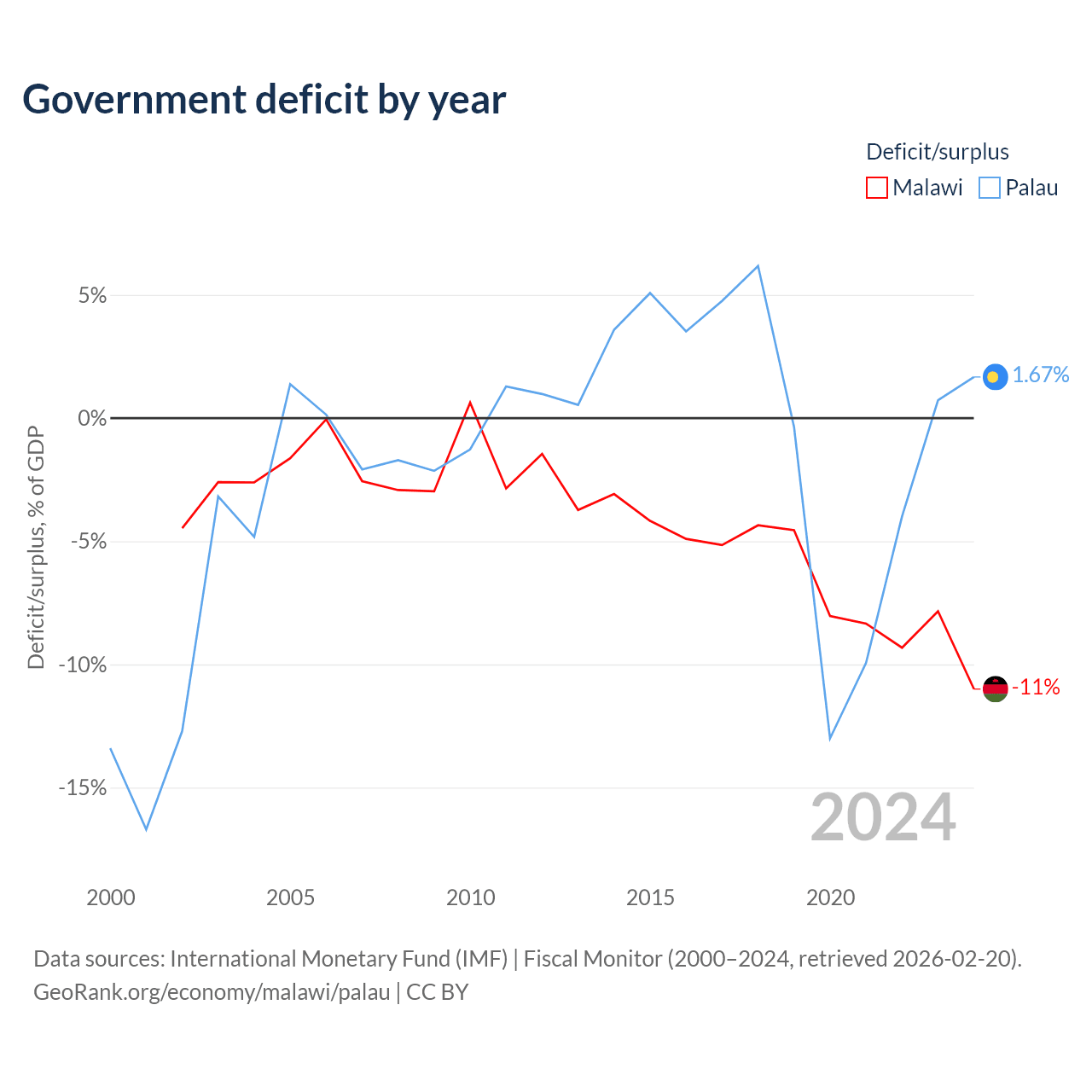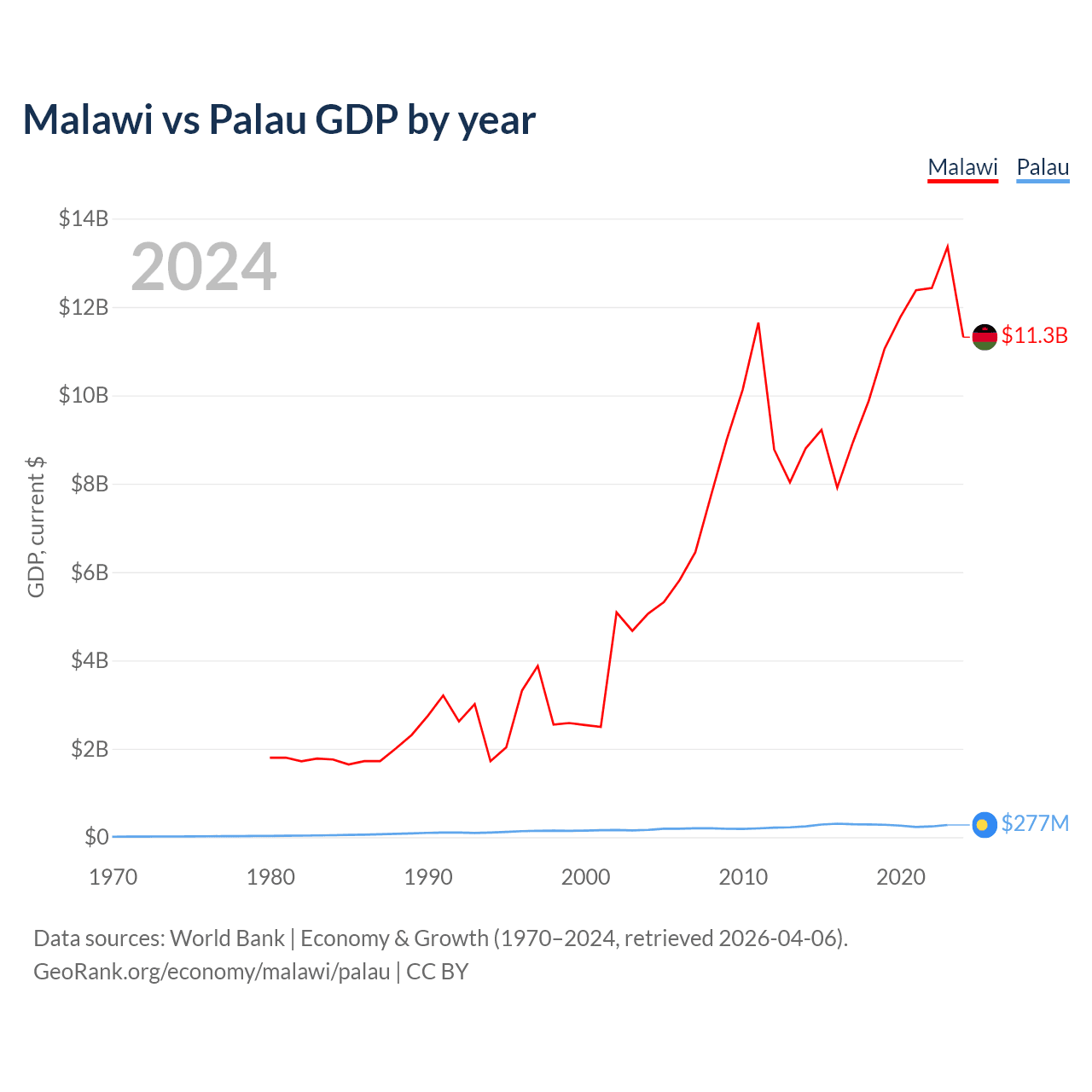 Malawi has a GDP of $11.3B compared to $277M for Palau, ranking 151/197 and 194/197 by economy size, respectively.