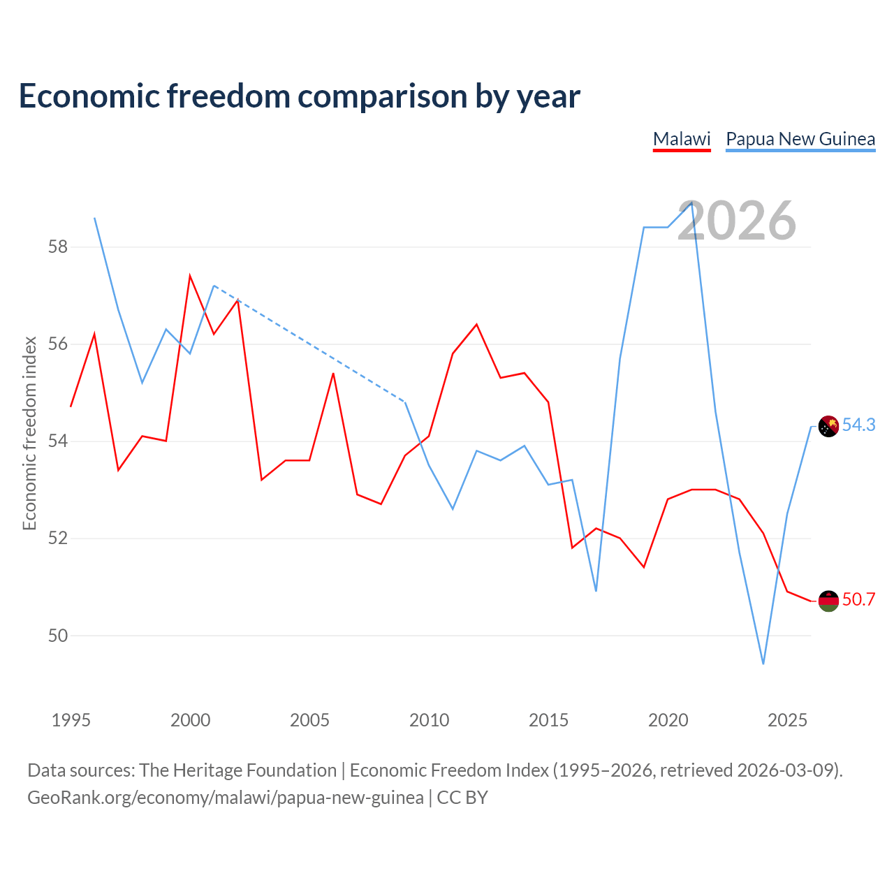 The Economic Freedom Index for Malawi is 50.7, ranking 159/197, compared to 54.3 for Papua New Guinea, ranking 134/197. The chart above displays a comparison of annual changes in economic freedom indexes.
