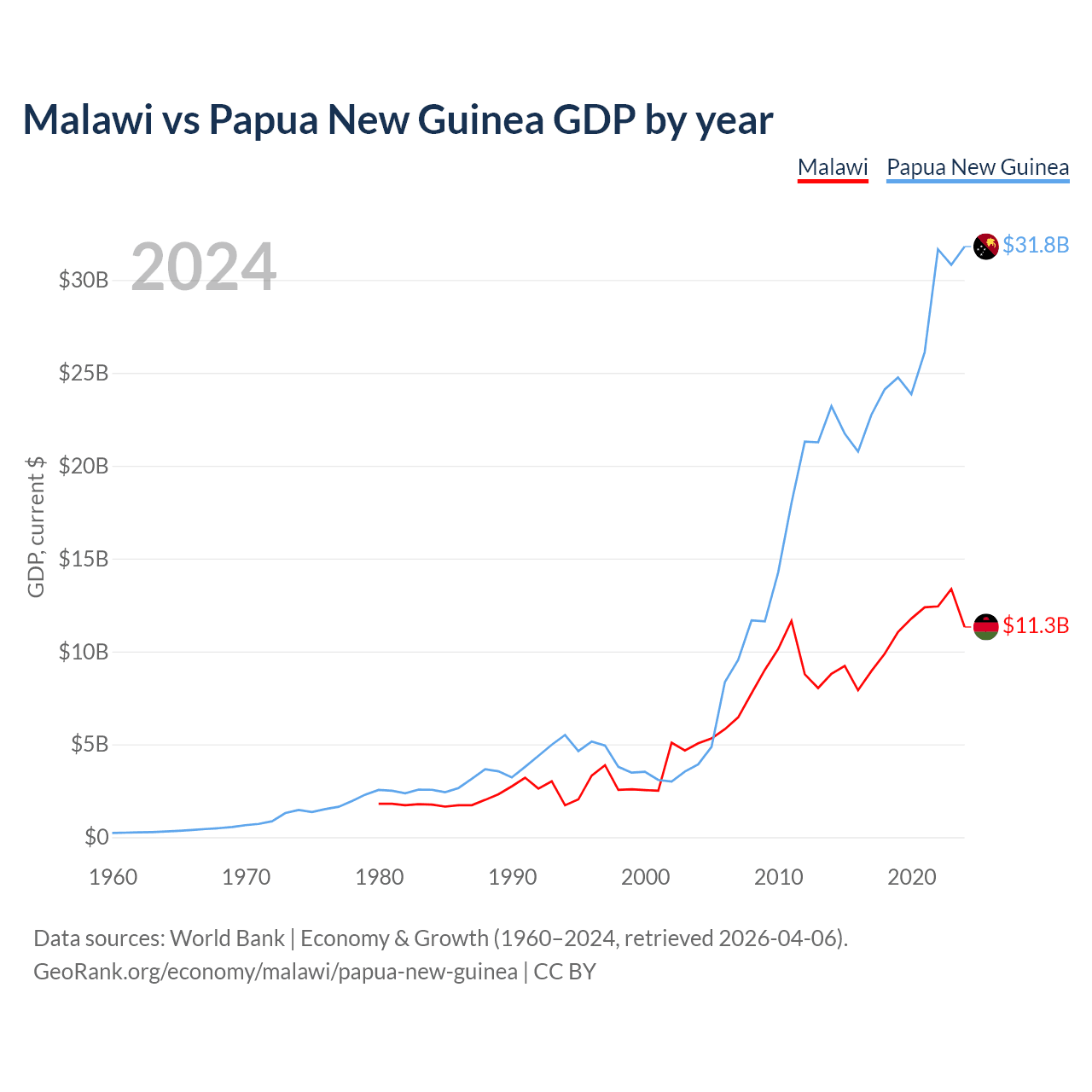 Malawi has a GDP of $11.3B compared to $31.8B for Papua New Guinea, ranking 151/197 and 110/197 by economy size, respectively.