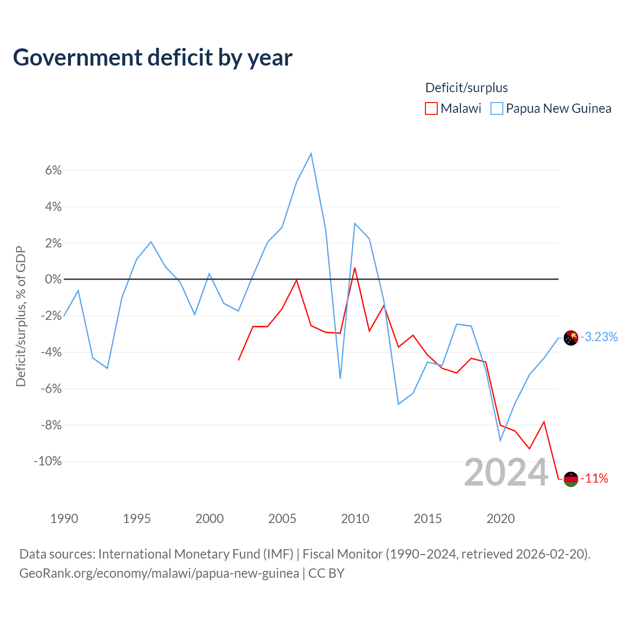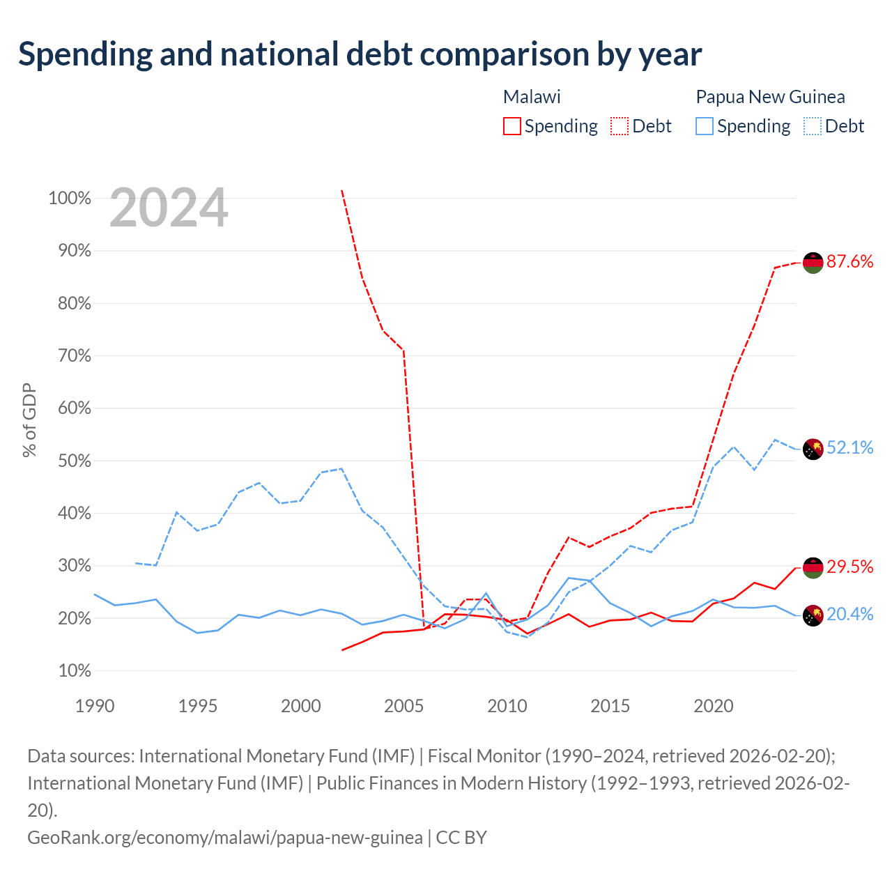 Malawi has $9.91B in government debt (87.6% of GDP), compared to $16.6B (52.1% of GDP) in Papua New Guinea.